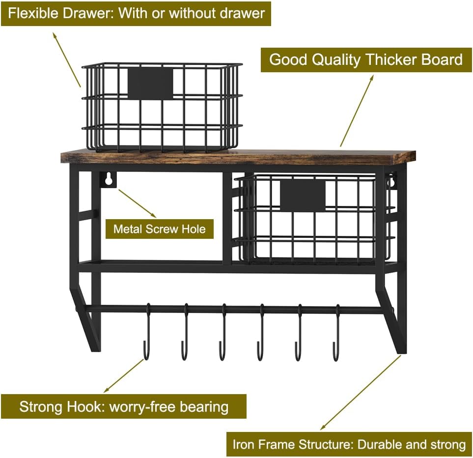 Helsin Industrial Wall Mounted Metal Wood Floating Shelves with Baskets Hooks Hanging Display Shelf Sundries Holder for Coffee Bar Kitchen Bathroom Organization and Home Decor, Black (16inch, 1 Set)