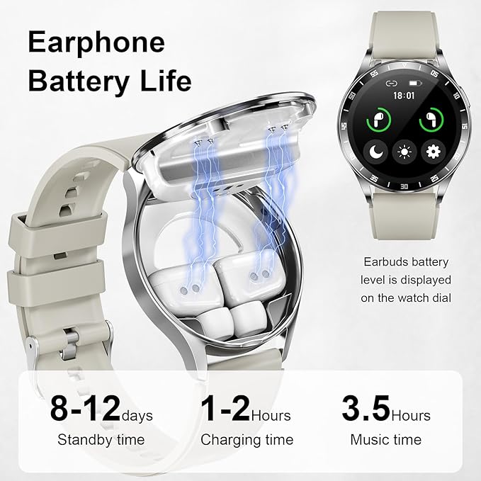 - Powerful Battery: Build-in 250mAh polymer battery for watch and 30mAh polymer battery for earbuds. Large capacity and low power consumption design offers longer endurance. 8-12 days Standby. The smart watch can charge the earphones for 2-3 cycles times.