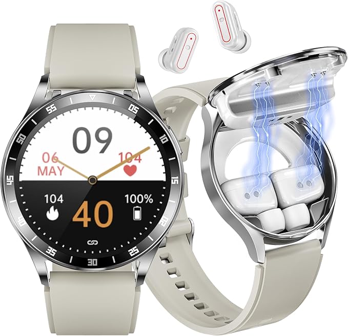 - New design for 2 in 1: Smart watch with TWS bluetooth earbuds, perfect combination of smart watch, bluetooth headphone. All metal steel dial, full of high-tech feeling.