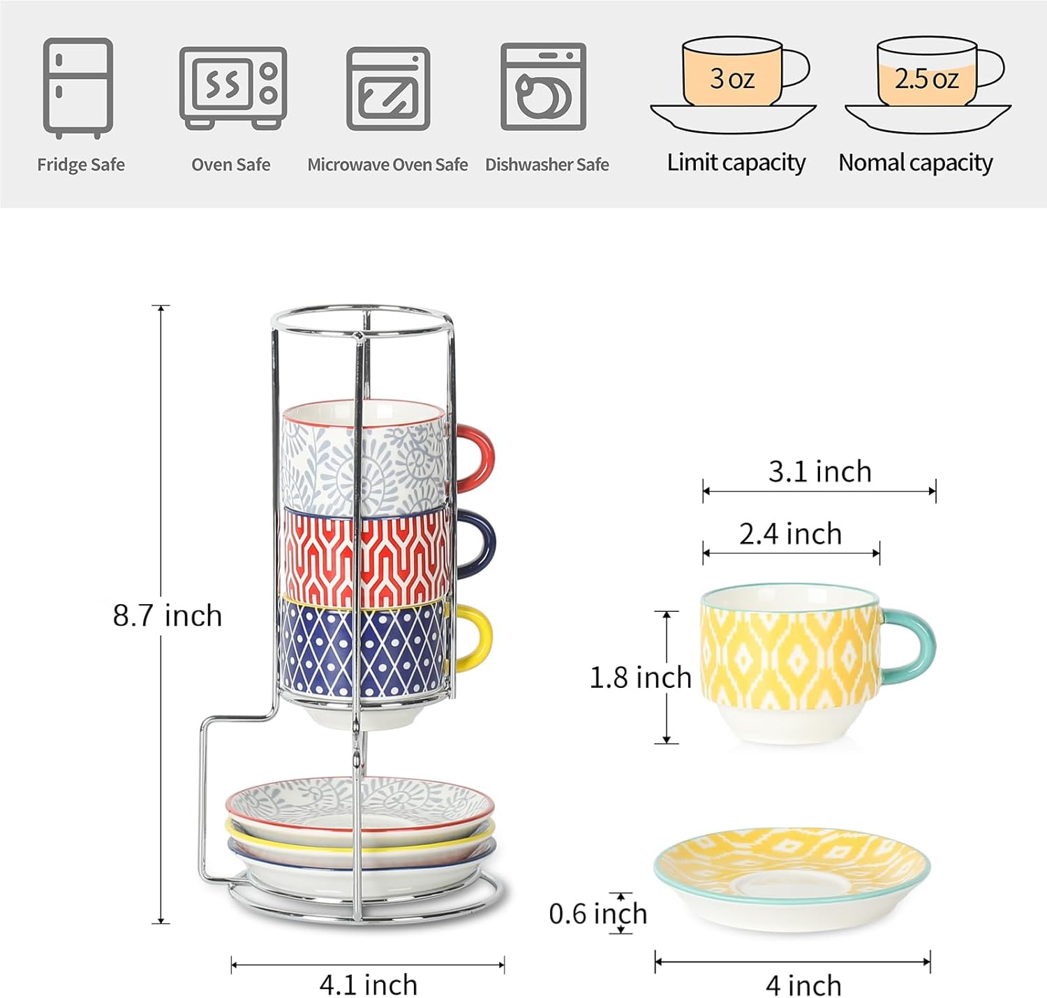 - GREAT ESPRESSO CUP SET COMBINATION, SPACE SAVING - These stackable espresso cups are compact to take up little space and come with a sturdy metal stand that can avoid being randomly placed. The matching saucers provide a place to rest your spoon and make you enjoy the mood of traditional Italian Coffee in an elegant way.