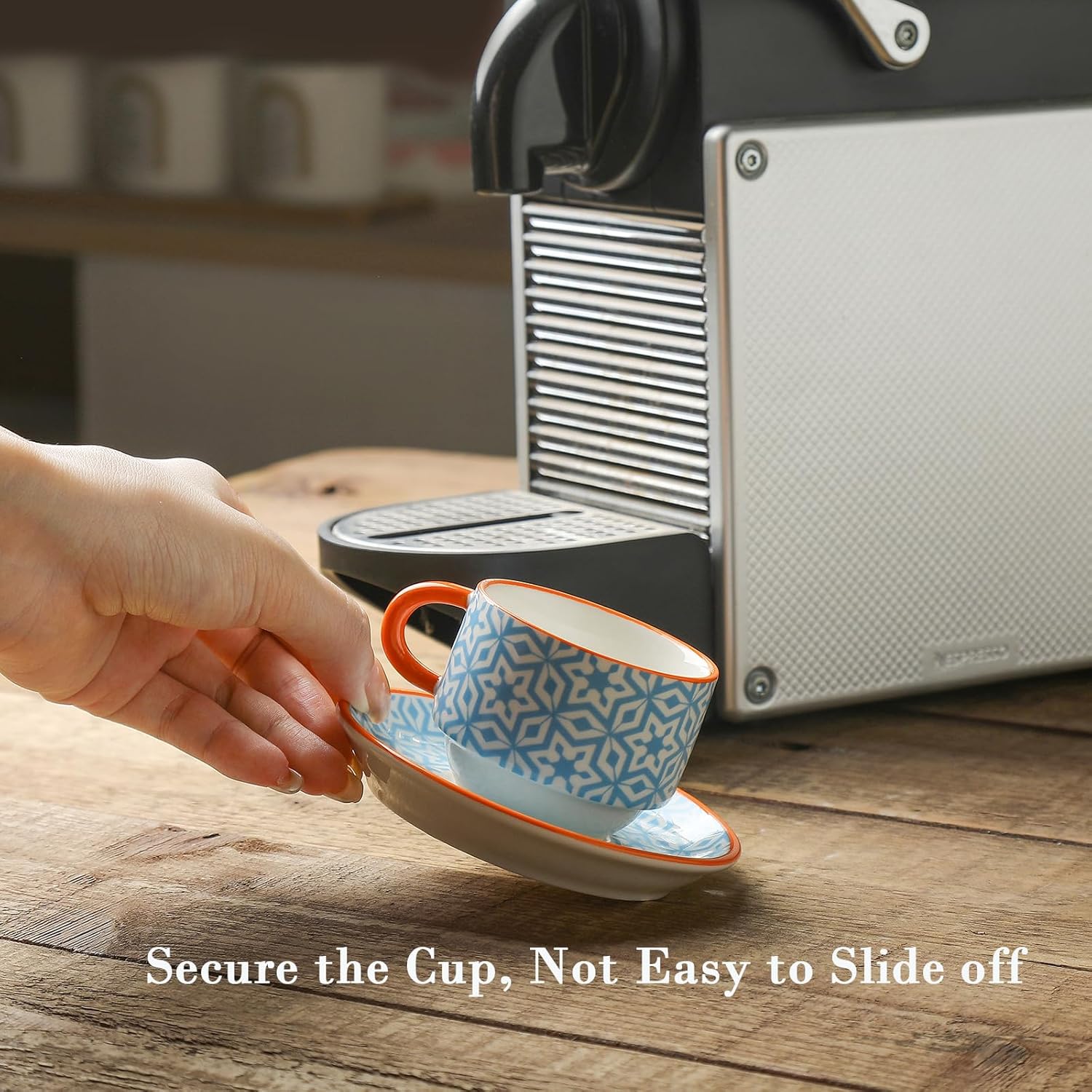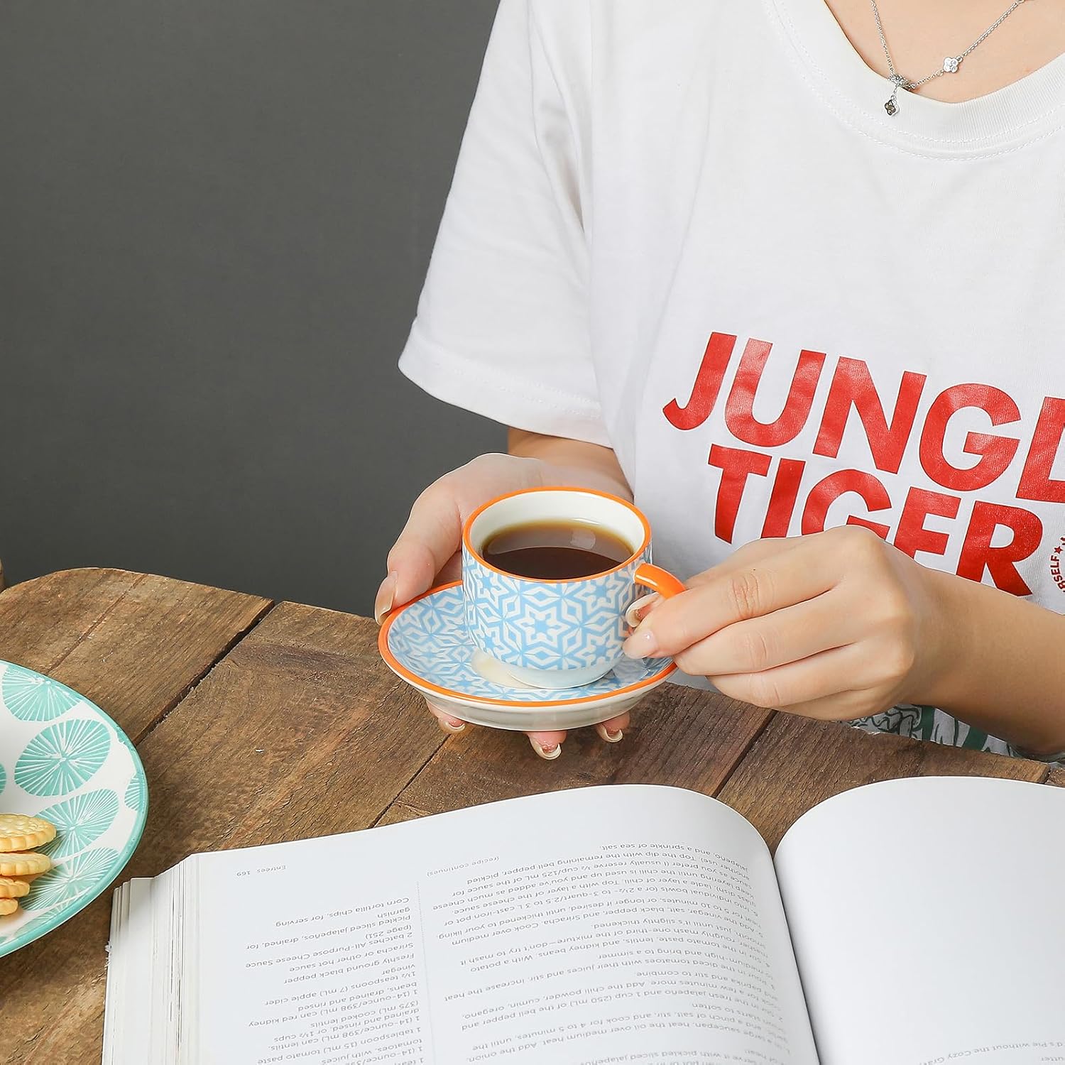 - DELICATE DESIGN - Each demitasse cup with its matching saucer has unique patterns and bright colors, which look outstanding to display near your espresso machine! Using these delicate cups makes you cheerful and feels like you are in a cafe.