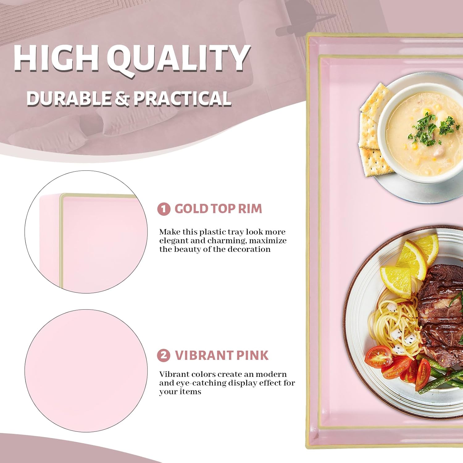 - HOME DECOR: These serving trays for ottoman feature a solid pink finish and gold rim top, which can add a touch of elegance to your living space. The smooth surface makes these vanity trays very easy to clean, just wipe gently with a damp cloth or paper towel and then dry it immediately.