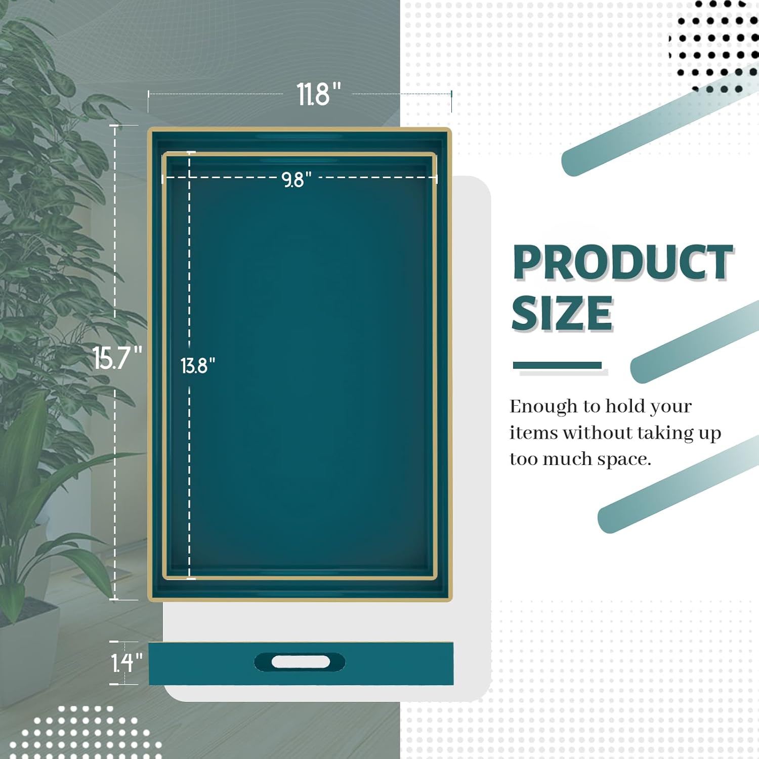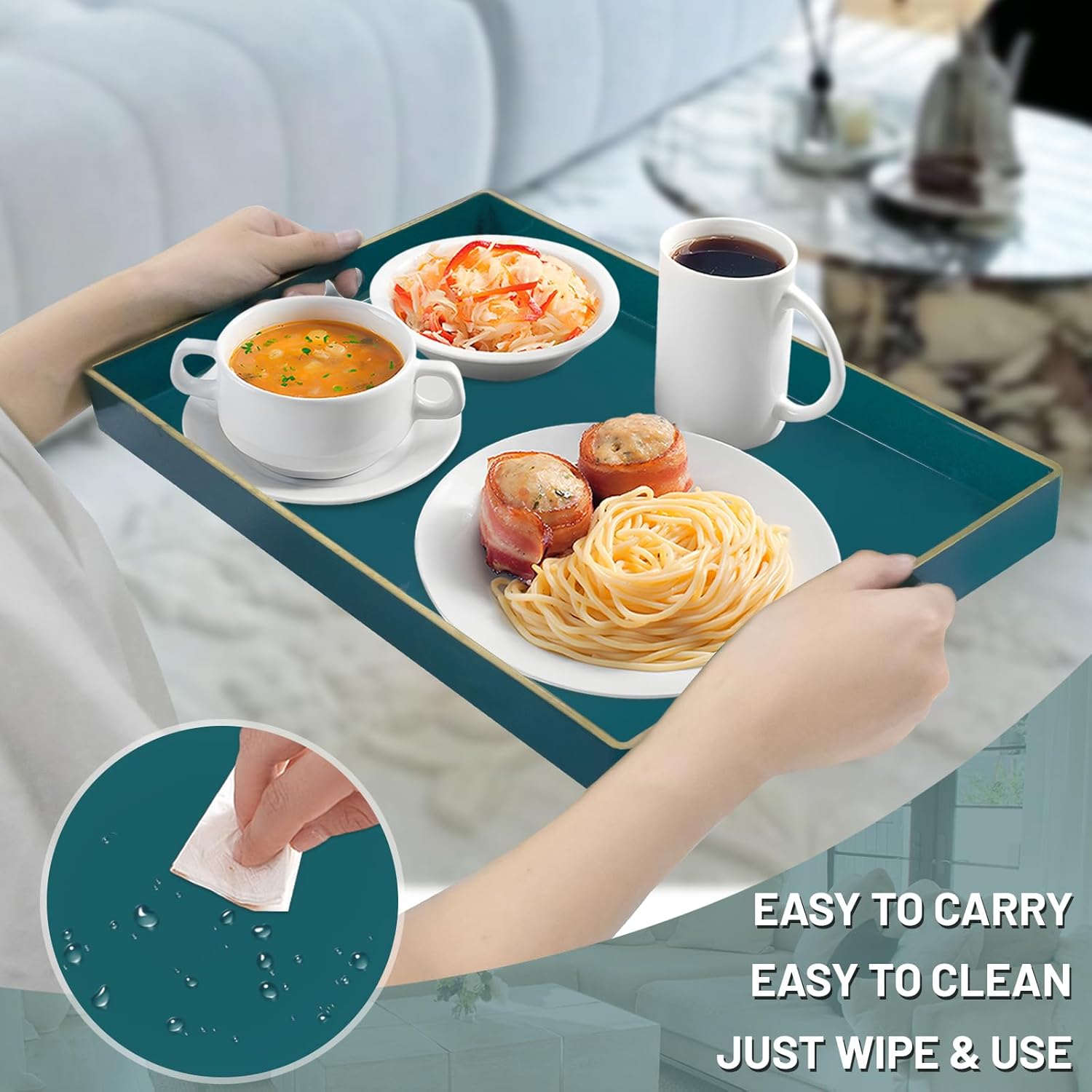 - HOME DECOR: These serving trays for ottoman feature a solid green finish and gold rim top, which can add a touch of elegance to your living space. The smooth surface makes these vanity trays very easy to clean, just wipe gently with a damp cloth or paper towel and then dry it immediately.