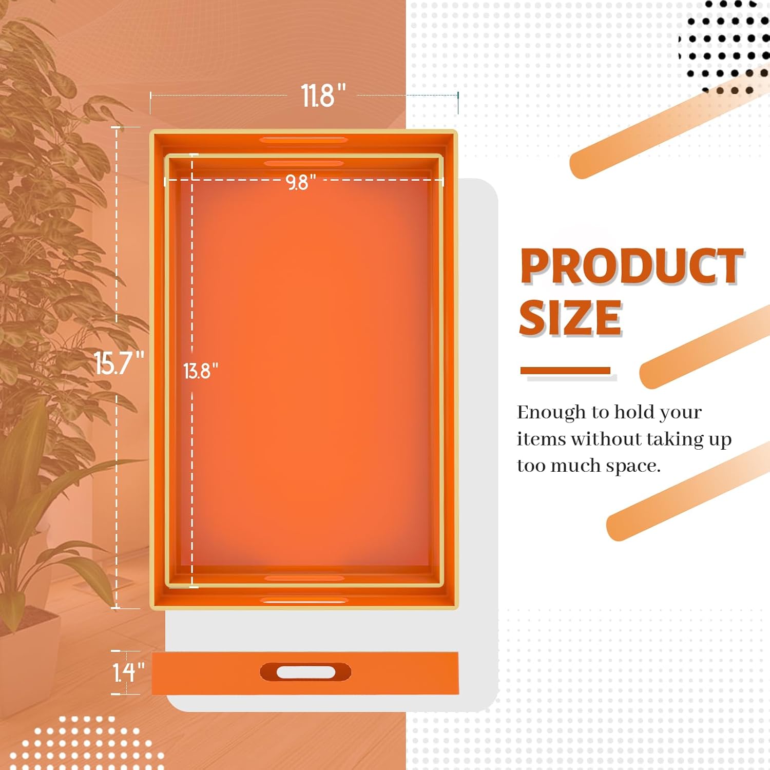 MAONAME Orange Serving Trays Set of 2, Plastic Decorative Trays with Handles, Rectangular Coffee Table Trays for Ottoman, Nesting Trays for Living Room, Bedroom