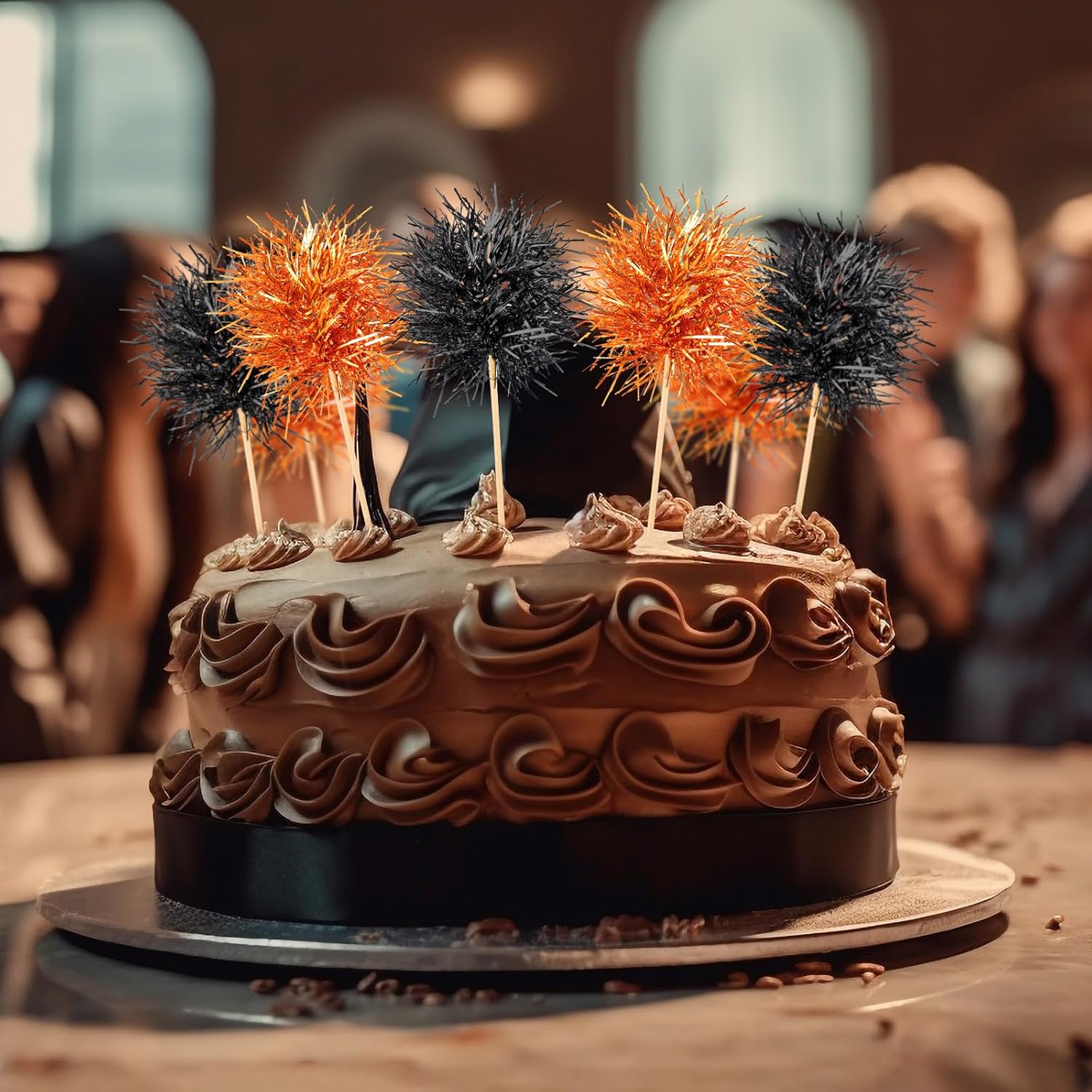 Chinco 100 Pcs Foil Firework Cupcake Toppers Sparkle Tinsel Cake Toppers Cake Decoration Cocktail Fruit Toothpick for Birthday Wedding Graduation Party(Orange, Black)