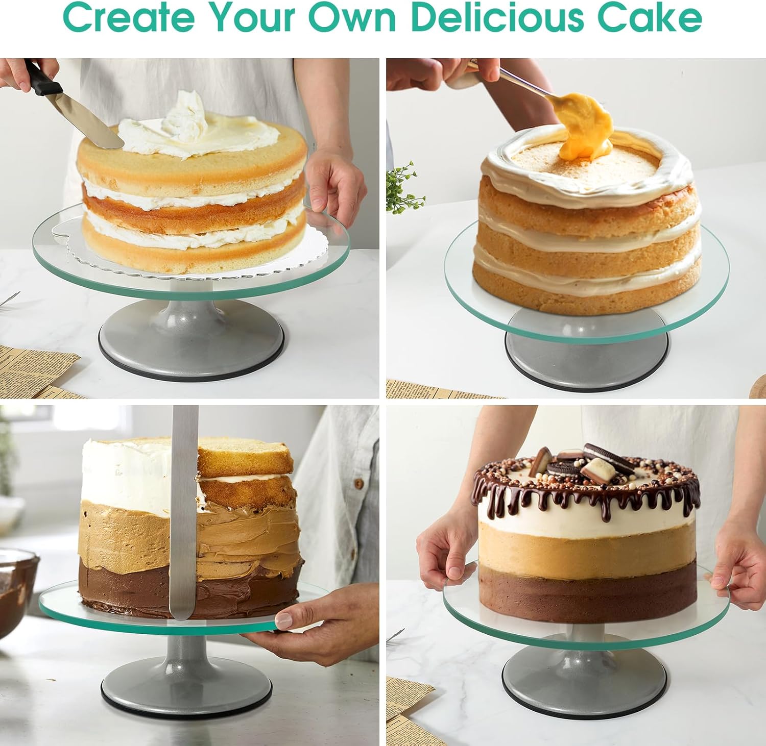 - 【Premium & Rotation Design】The cake decorating turntable is made of premium glass to safe, non-toxic and durable. This cake stand can perfectly carry 12inch/30cm cake, apple pie. 360° Rotation design, smooth and silent, no matter left hand or right hand can be used well.