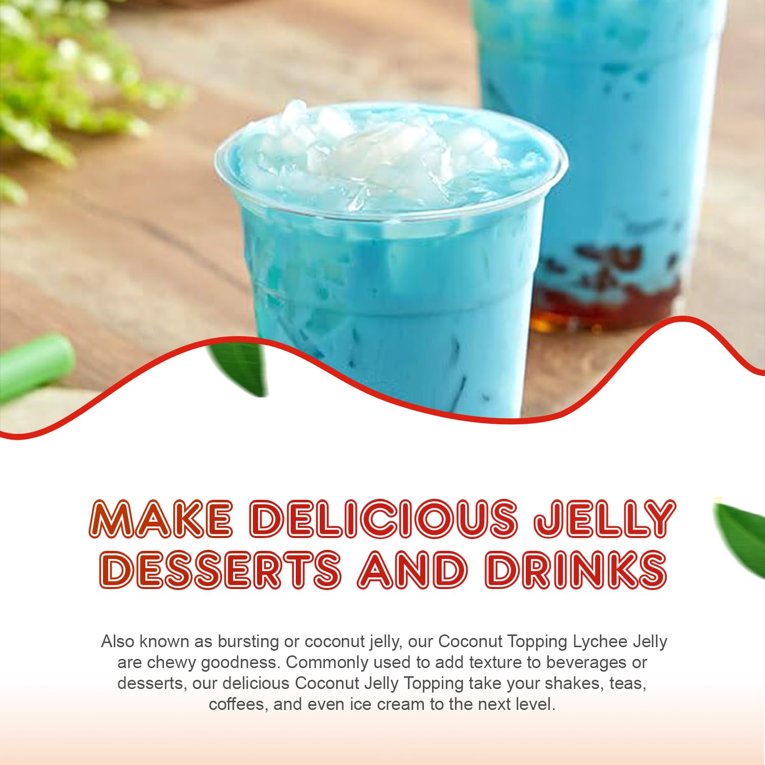 - 𝐔𝐧𝐢𝐪𝐮𝐞 𝐓𝐞𝐱𝐭𝐮𝐫𝐞: This coconut jelly topping has a jelly-like consistency thicker than gelatin, providing a unique and compelling texture for drinks and desserts. The coconut jelly with nata de coco distinct feel enhances the overall sensory experience of the beverages or dishes it's added to.