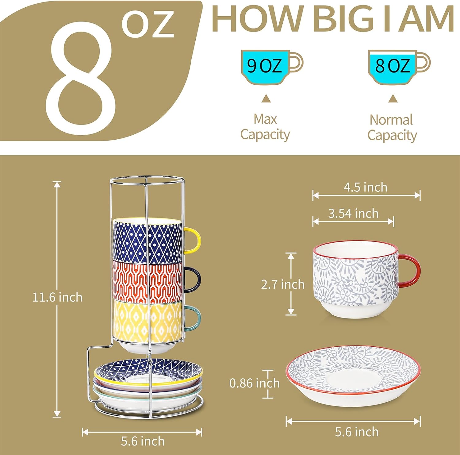 - STACKING BOTTOM DESIGN & METAL STAND, SPACE SAVING - These stackable espresso cups are compact to take up little space and come with a sturdy metal stand that can avoid being randomly placed. The matching saucers provide a place to rest your spoon and make you enjoy the mood of traditional Italian Coffee in an elegant way.