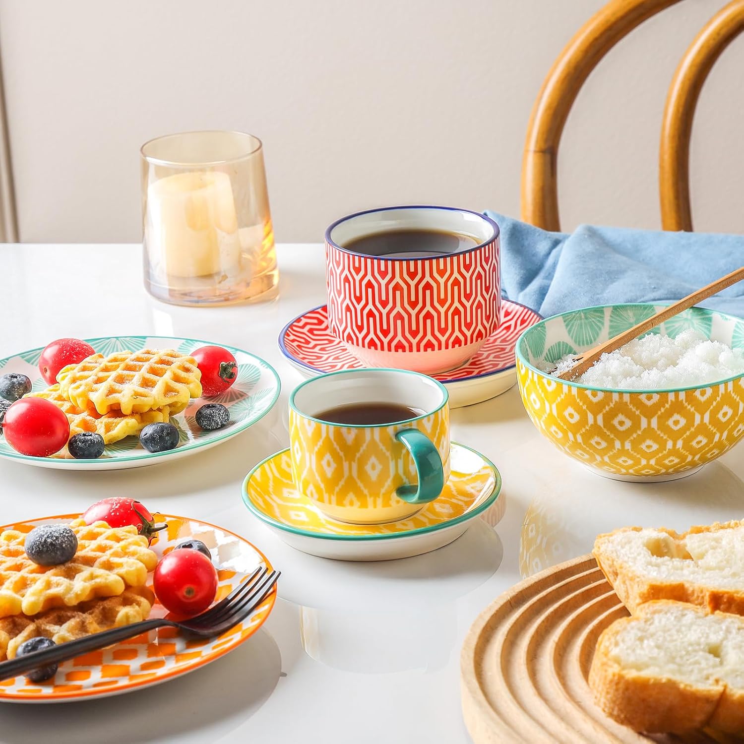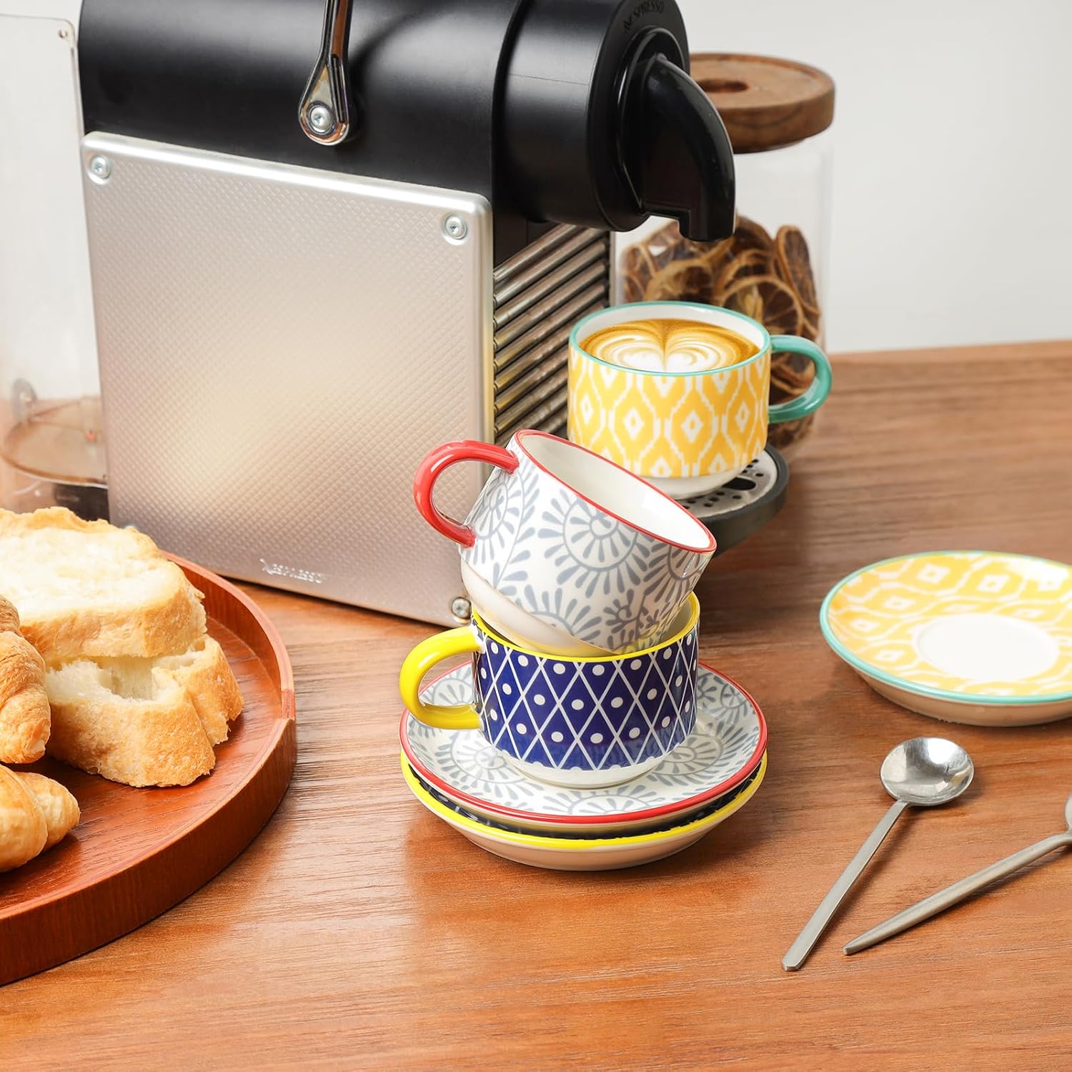 - DELICATE EXTERIOR DESIGN - Each small cappuccino cup with its matching saucer has unique patterns and bright colors, which look outstanding to display near your espresso machine! Using these delicate cups makes you cheerful and feels like you are in a cafe.