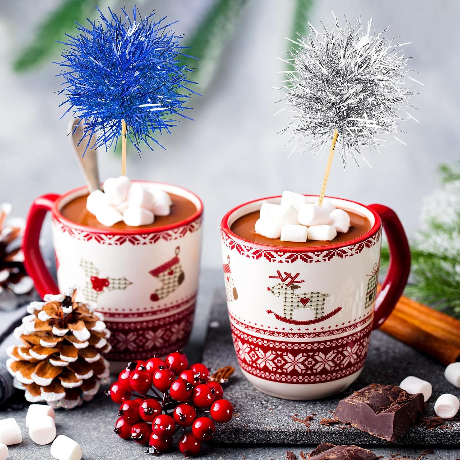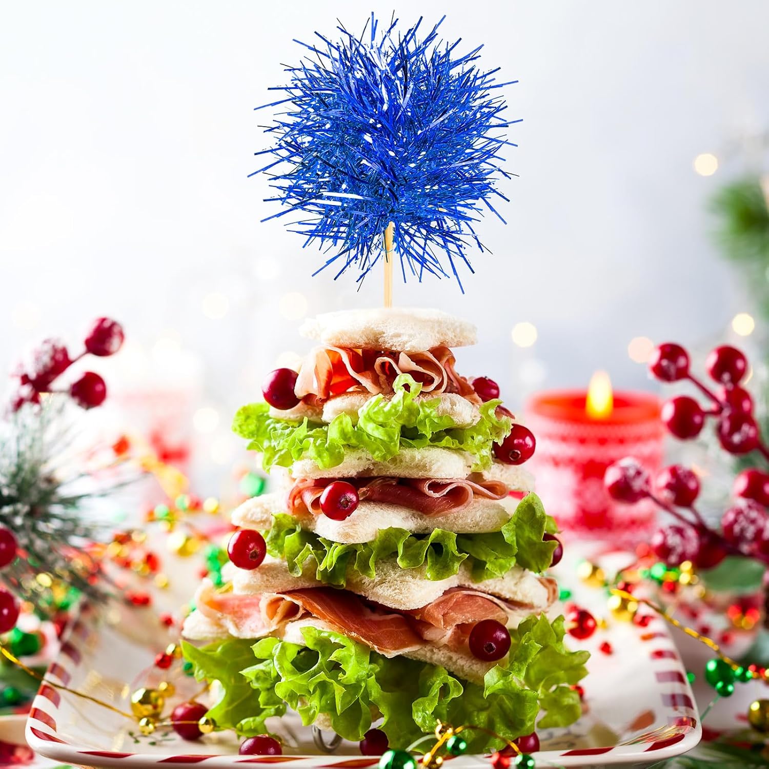 Chinco 100 Pcs Foil Firework Cupcake Toppers Sparkle Tinsel Cake Toppers Cake Decoration Cocktail Fruit Toothpick for Birthday Wedding Graduation Party(Dark Blue, Light Blue, Silver)