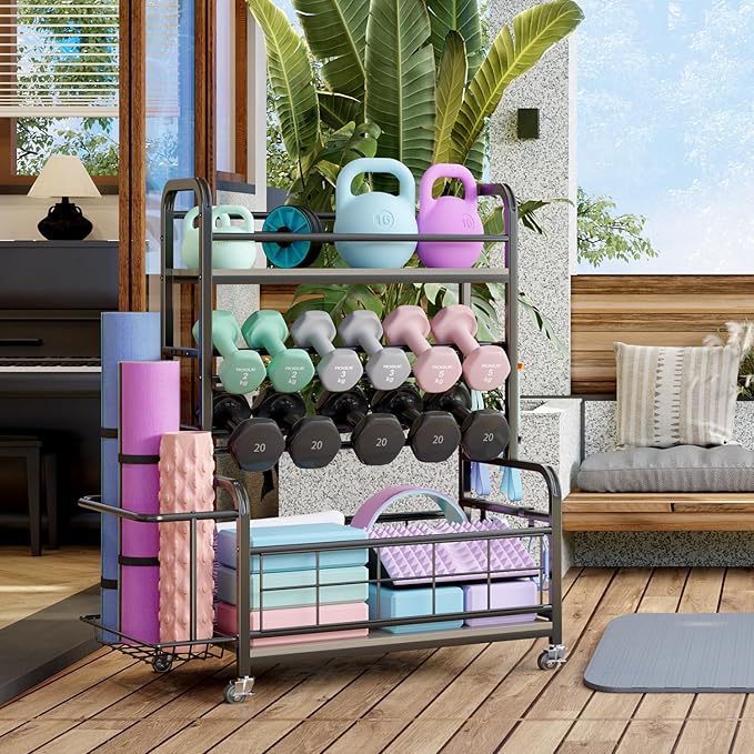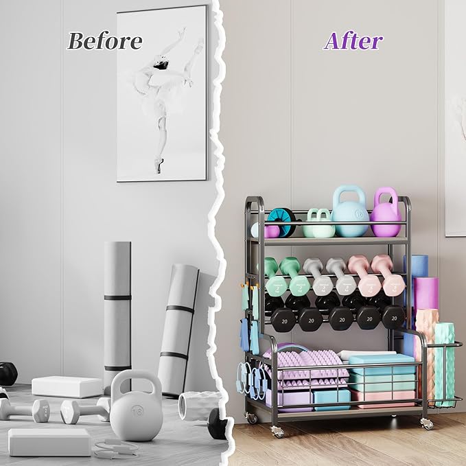 - ALL-IN-ONE HOME GYM STORAGE RACK: This weight storage racks is equipped with top plank layer for storing kettlebells, 2-layer dumbbell rack,a side basket for storing yoga mat and foam rollers, 6 side hooks for fitness resistance band,bottom storage rack is perfect for storing balls, yoga blocks and other exercise equipment.Perfect for organizing your various gym equipment into one storage rack, easy to save your space and stay organized