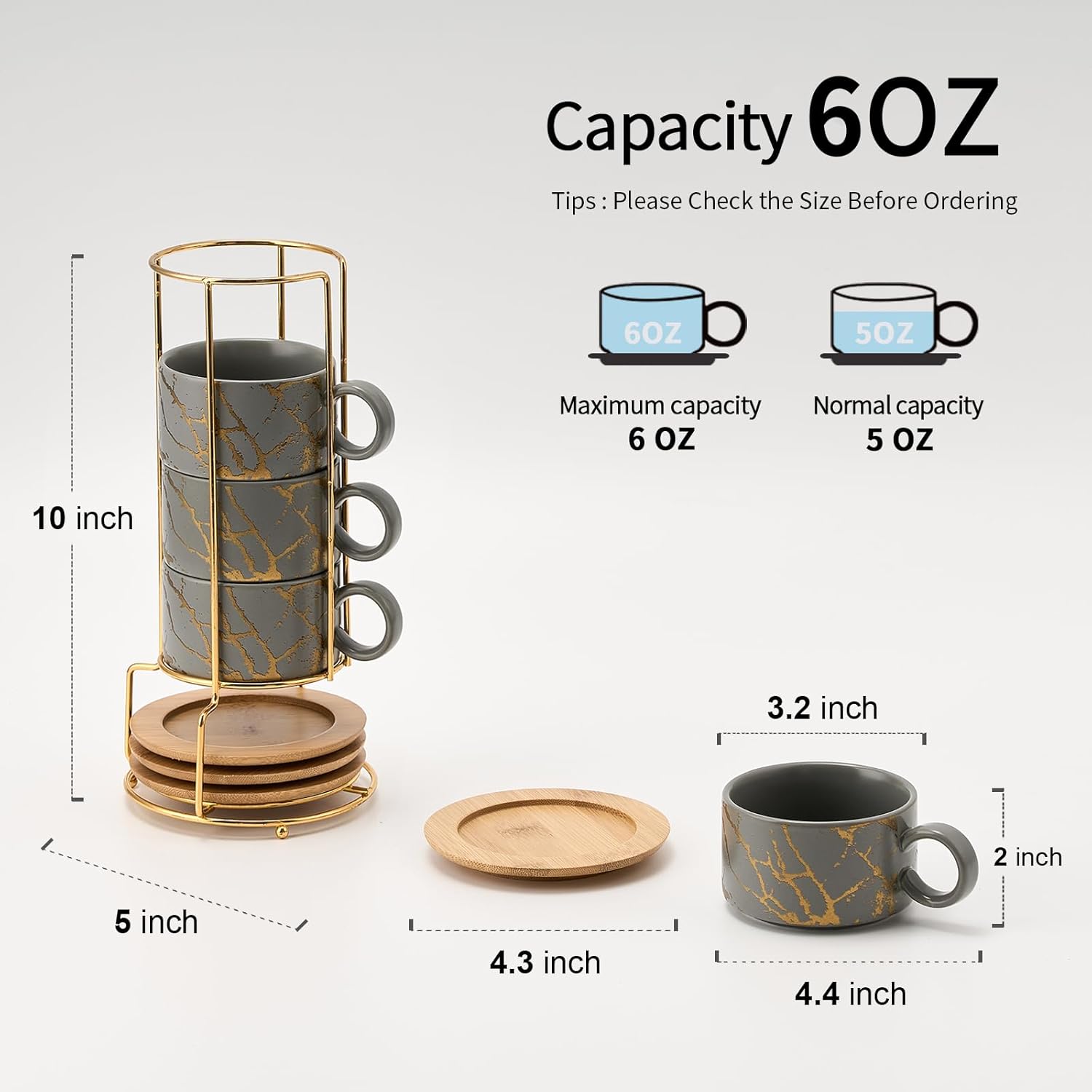 LUKA 6 Ounce Porcelain Stackable Espresso Cups with Saucers and Metal Stand Set of 4, Ceramic Cappuccino Cups Set for Specialty Coffee Drinks, Latte, Cafe Mocha and Tea, Gray