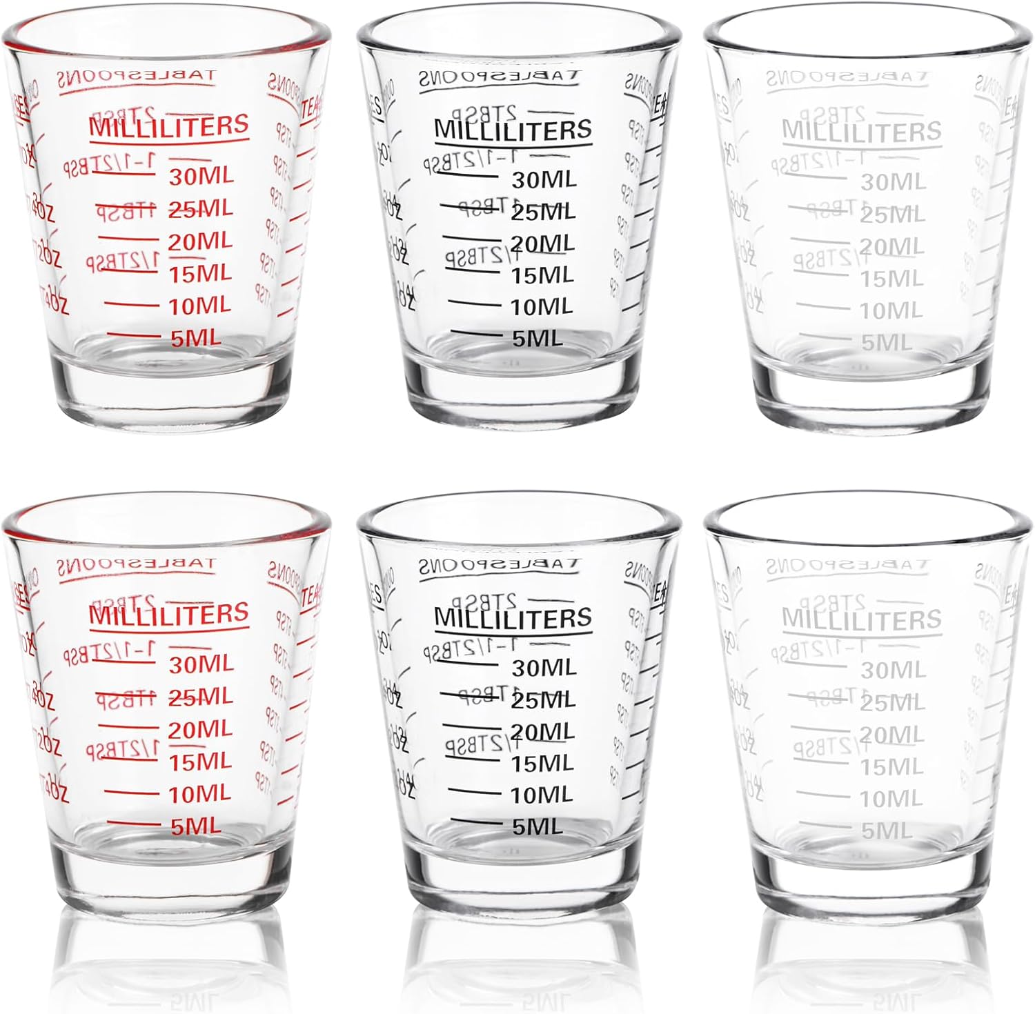 - 6 PACK MEASURING CUPS: You will get 6 piece set of measuring shot glass with printed red, black, white scale that are perfect for baking, cooking, mixing and more. Glass measuring cup Height: 6 cm/ 2.3 inches; Caliber: 5 cm/ 2 inches; Feet Diameter: 3.5 cm/ 1.3 inches
