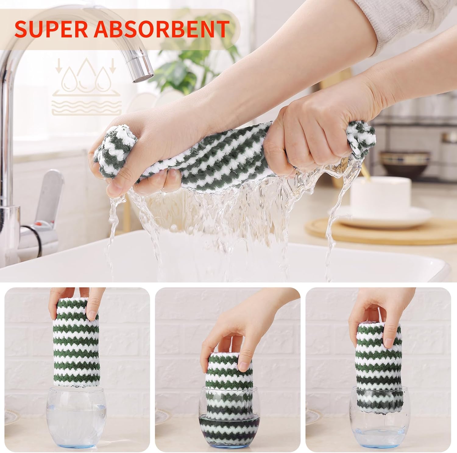 Homaxy 12 Pack Kitchen Dish Cloths, Ultra Soft and Absorbent Dish Towels, Reusable Fast Drying Microfiber Cleaning Cloth, Coral Velvet Wave Design No-lint, 10 x 10 inches, Grass Green