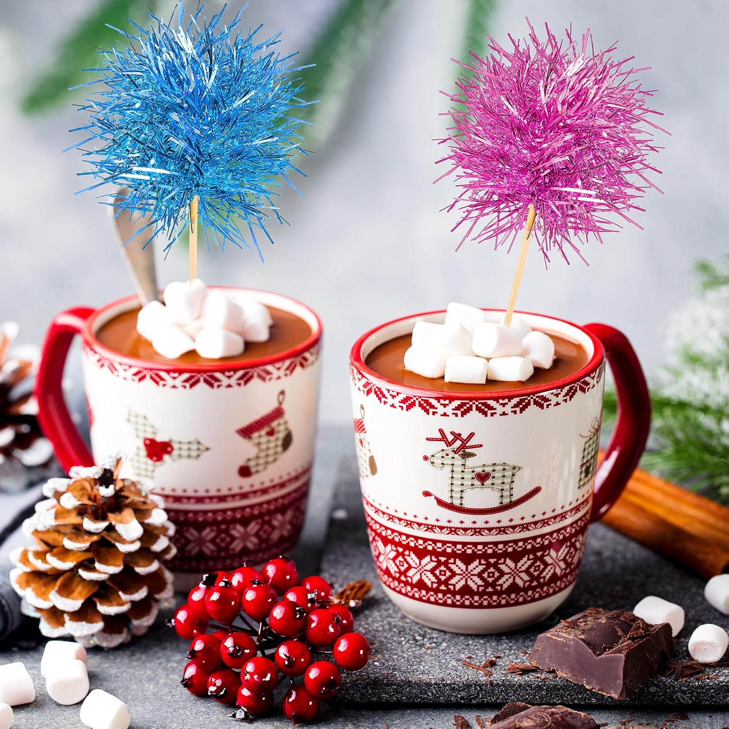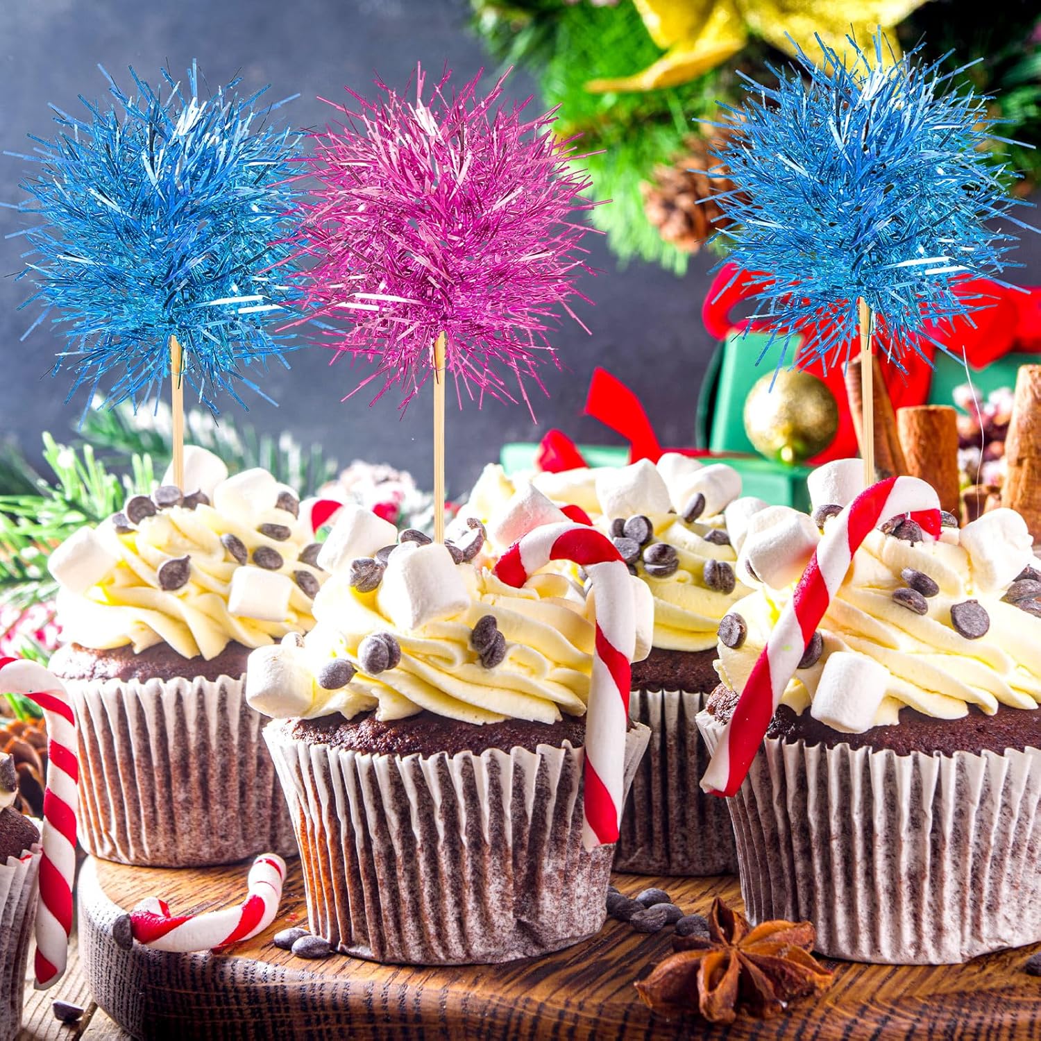 Chinco 100 Pcs Foil Firework Cupcake Toppers Sparkle Tinsel Cake Toppers Cake Decoration Cocktail Fruit Toothpick for Birthday Wedding Graduation Party(Pink, Light Blue)