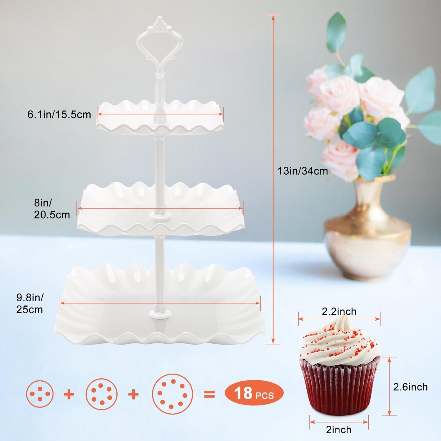 - Generous Capacity: Each 3-tiered cupcake stand is capable of holding up to 18 cupcakes (Size 2.6*2 inch), providing ample space for your delicious creations and ensuring a beautiful presentation.