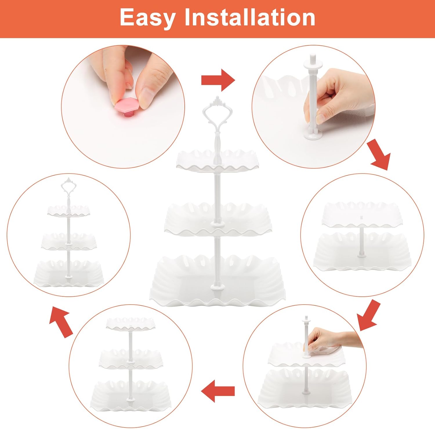 - Easy to Assemble: The whole cupcake stand has strength and stability by connecting the tiers with solid pillars and screws. Easy to assemble and requires no tools.