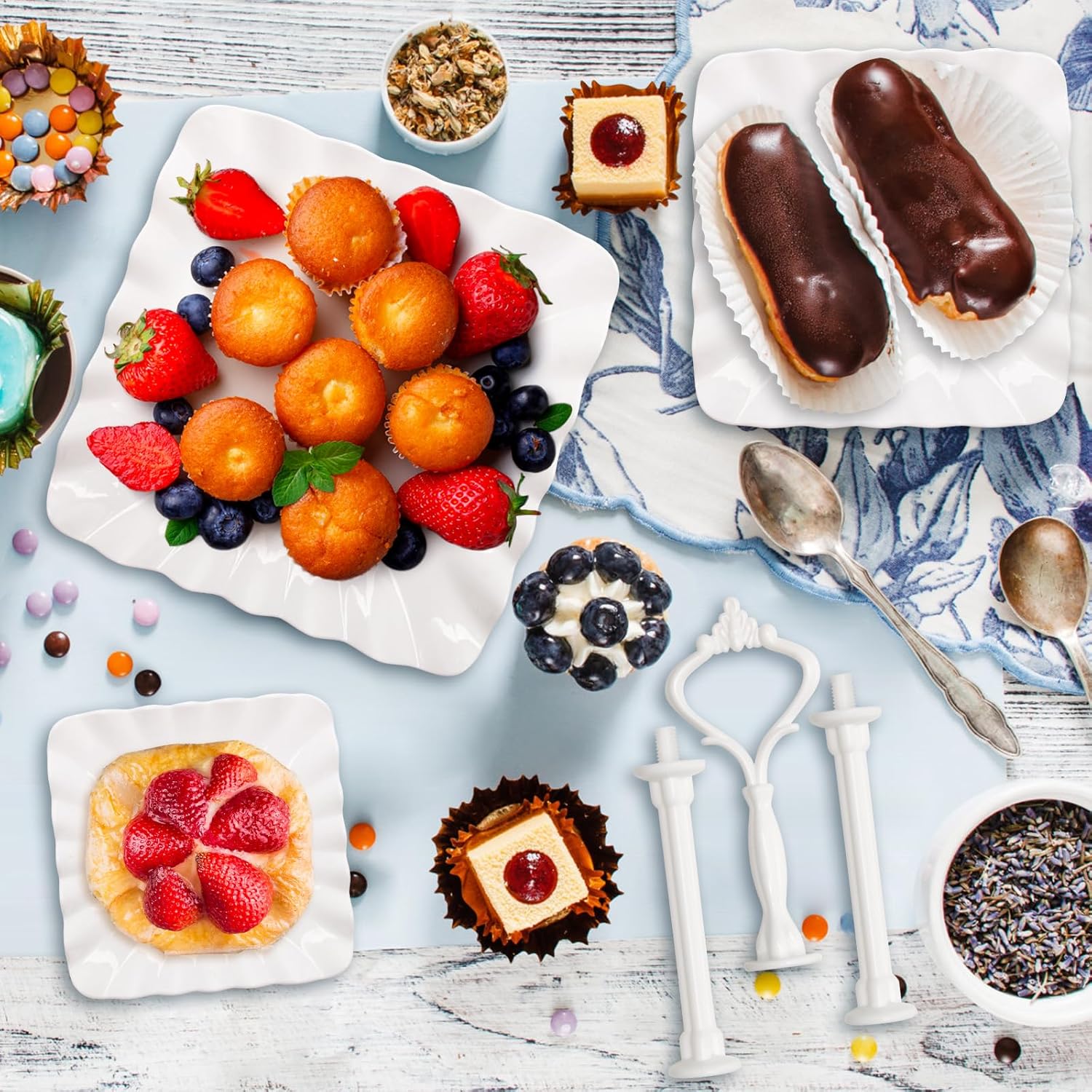 - Food Grade Material: 3 tiered serving standss are made of food safety PP material, stable and lightweight, perfect for displaying cupcakes, appetizers, brownies and other party treats.