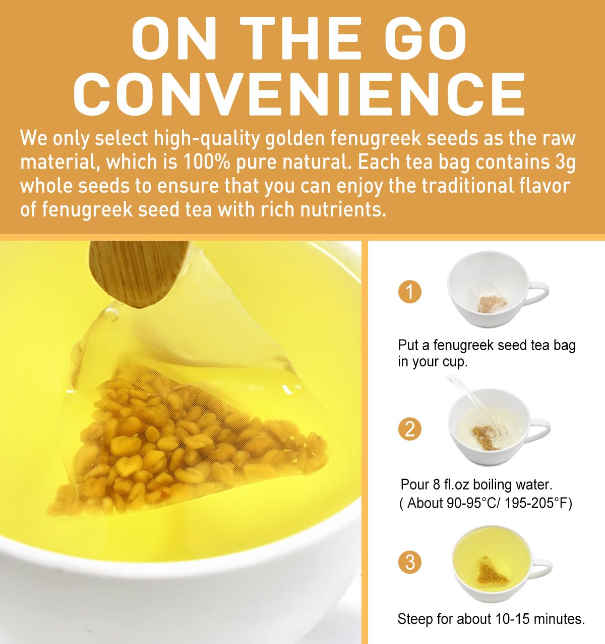 - PREMIUM INGREDIENTS: We select high-quality golden fenugreek seeds as the raw material, which is pure natural without any artificial additives. Each teabag contains 3g whole seeds to ensure the traditional flavor of fenugreek seed tea with rich nutrients;