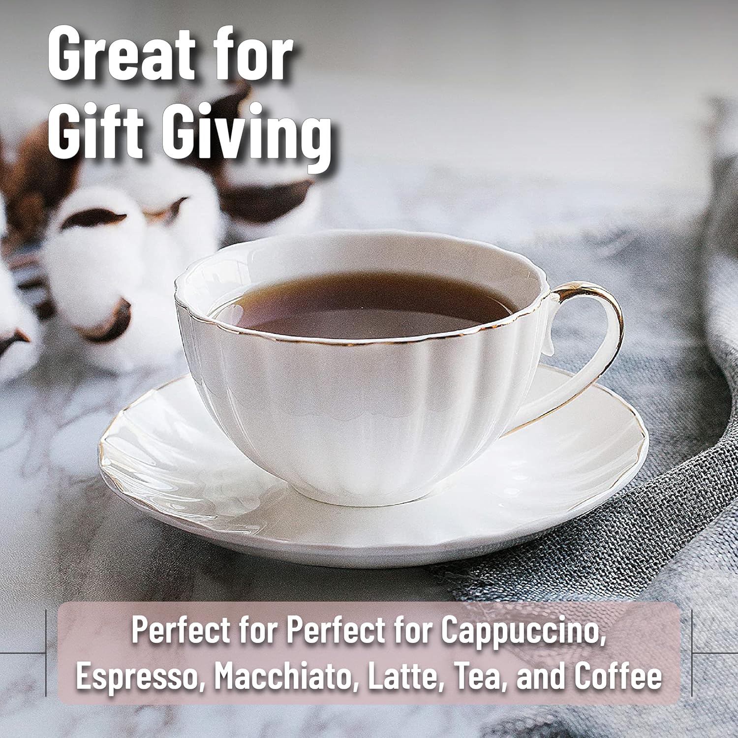 - Not microwave safe, BTaT set includes 12 beautifully crafted white porcelain tea cups and saucers, each adorned with a luxurious gold rim that adds a touch of elegance to any tea time.