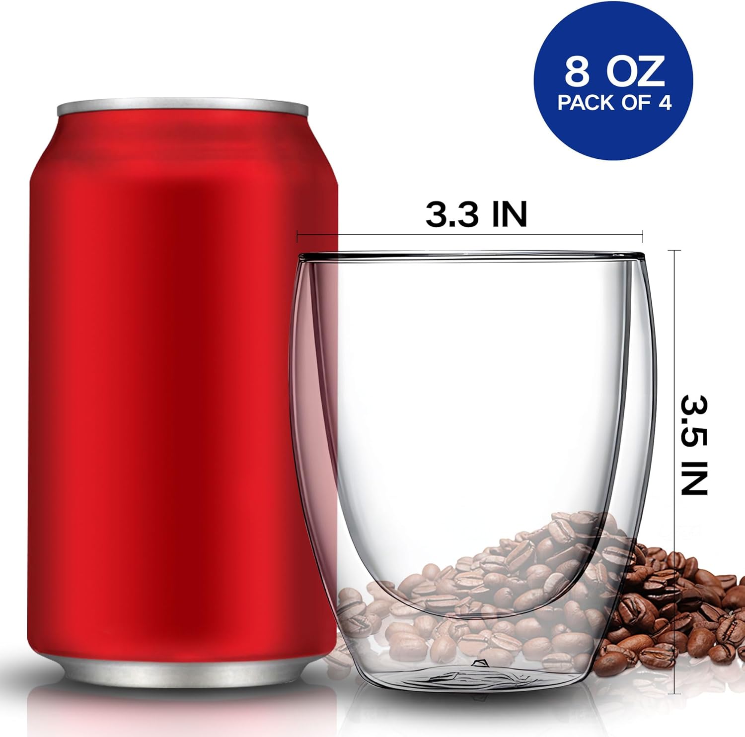 Set of 4 Double Walled Glass Coffee Mugs 8 Ounces Insulated Layer Coffee Cups Borosilicate Glass Espresso Cup for Hot Beverage,Cappuccino,Tea,Latte,Wine,Microwave Safe
