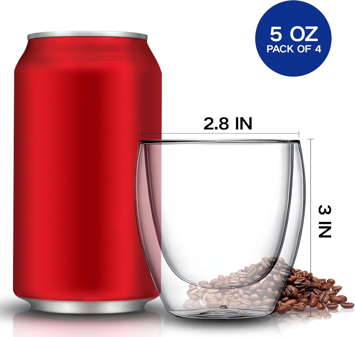 Set of 4 Double Walled Glass Coffee Mugs 5 Ounces Insulated Layer Coffee Cups Borosilicate Glass Espresso Cup for Hot Beverage,Cappuccino,Tea,Latte,Wine,Microwave Safe