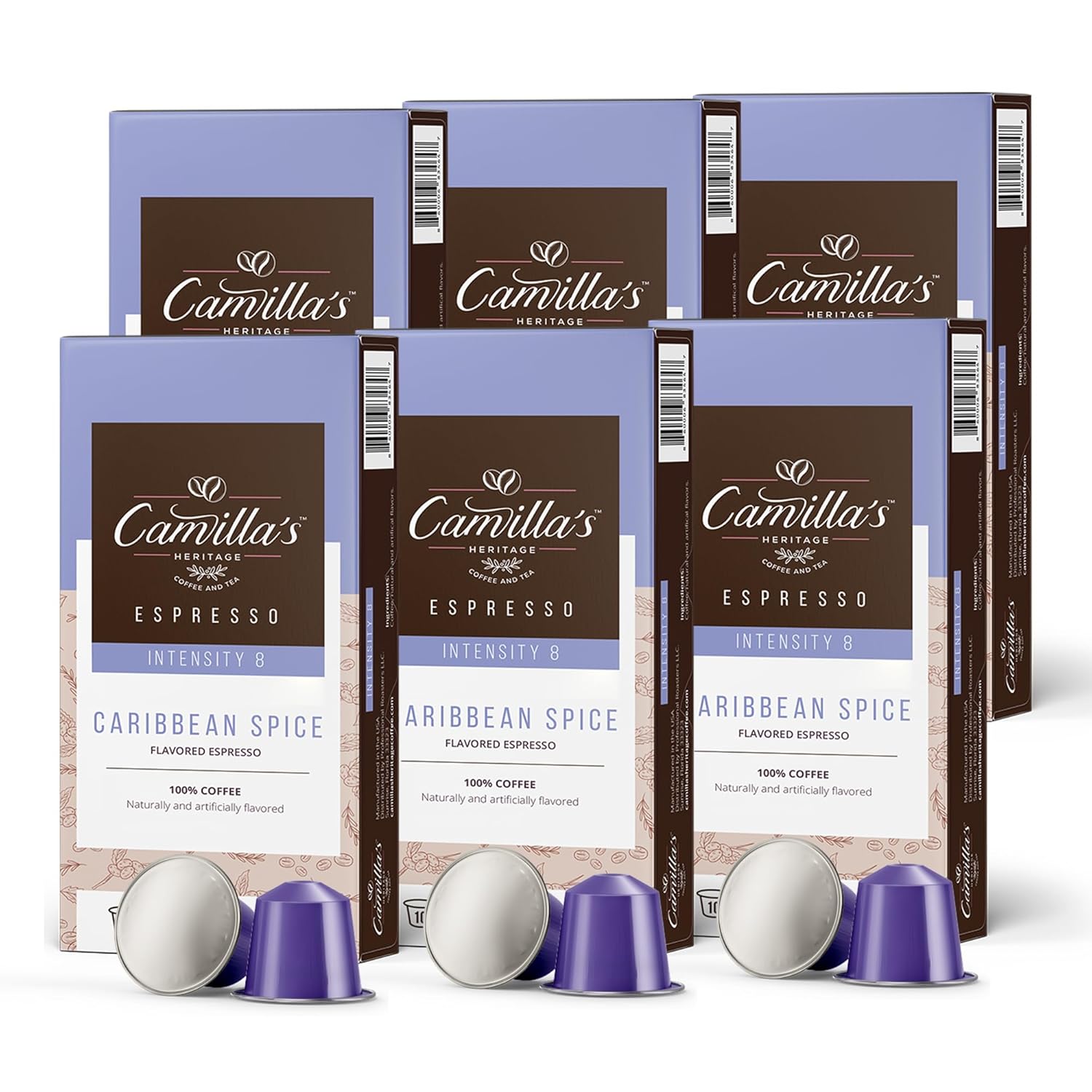 Camilla’s Heritage - Intensity 8 Caribbean Spice Flavored Espresso Coffee, Gourmet Espresso Cups, 60 Coffee Pods
