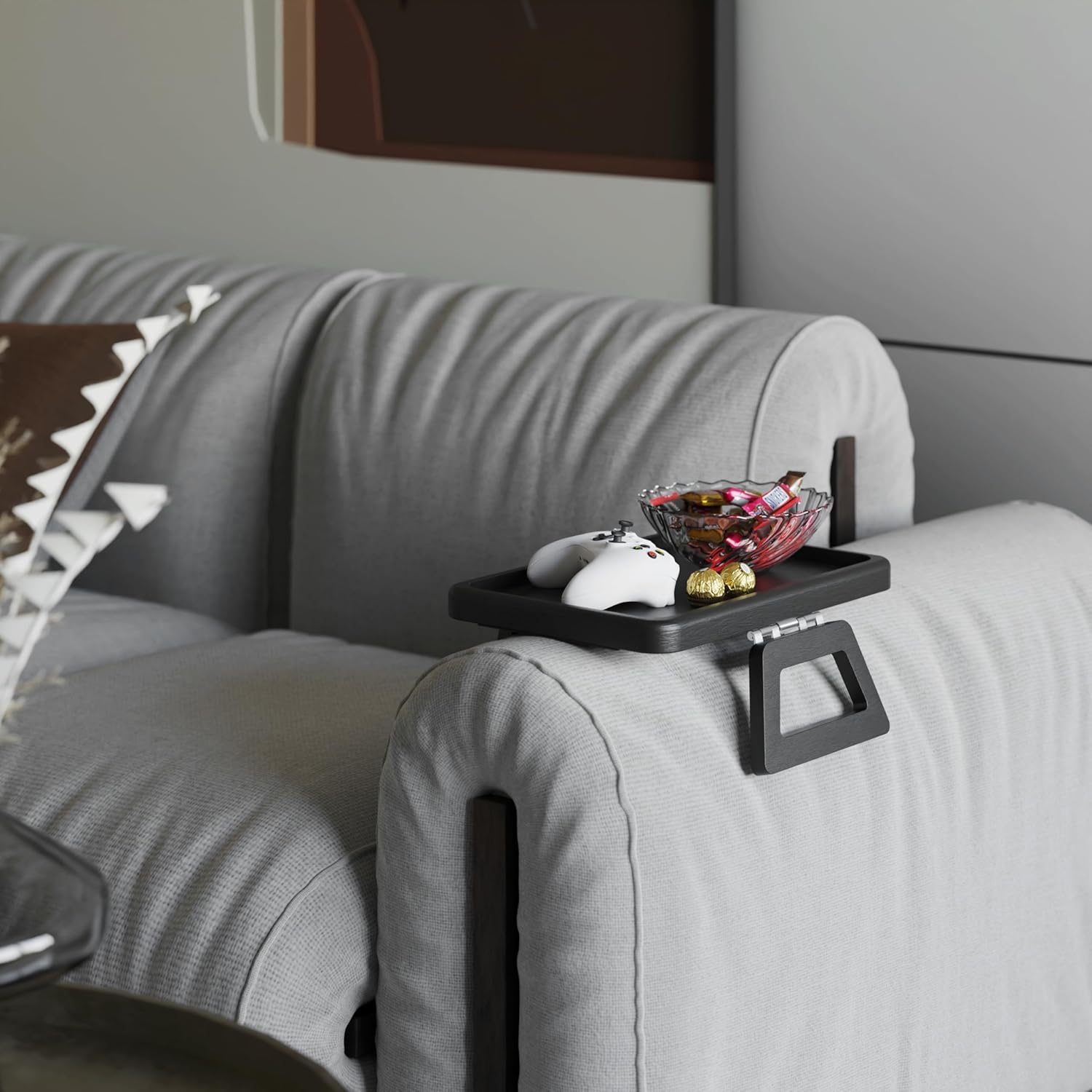 - Space-Saving Solution: Measure at 13.75“D x 9.5“W x 1“H this tray instantly clips onto your couch armrest, holding all your snacks, drinks, remotes, and devices. All without taking up extra space