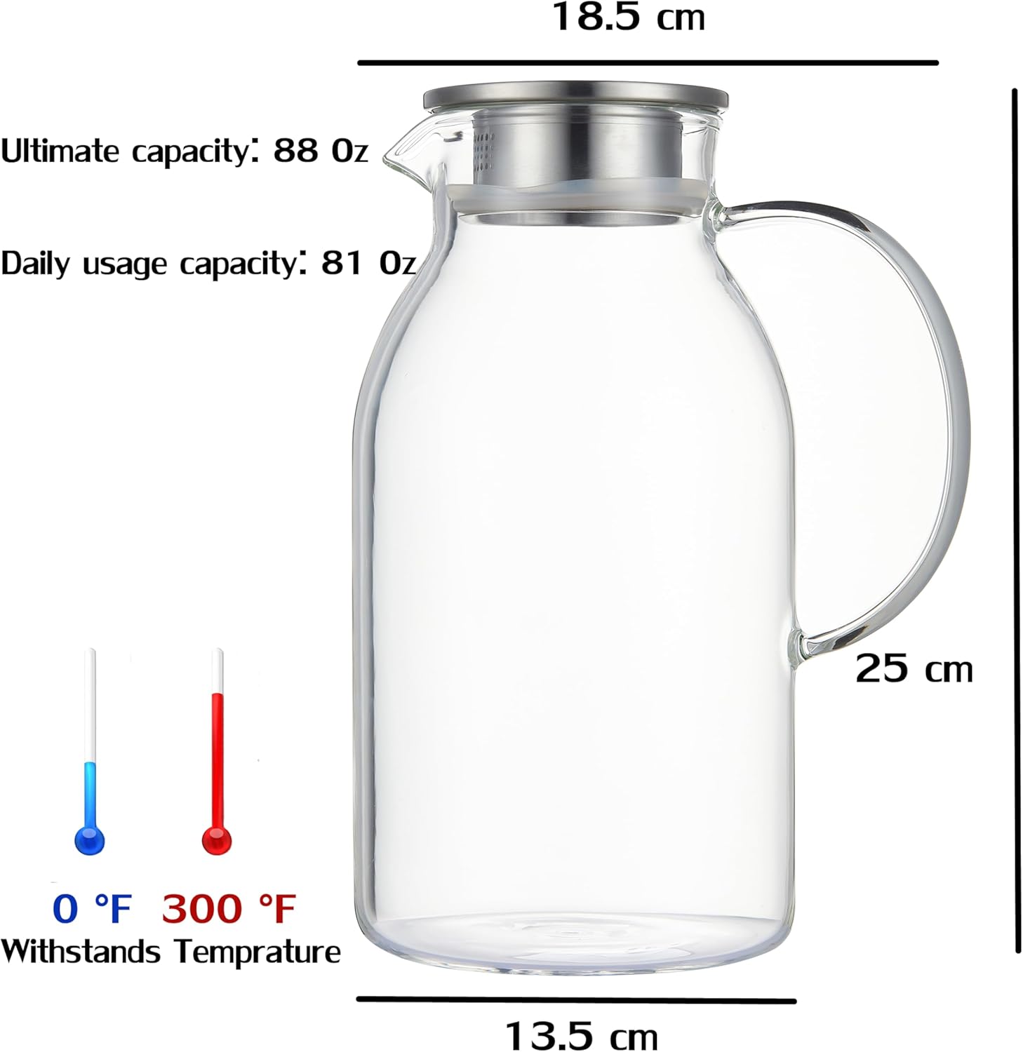 - [Premium Quality] Safe to put boiling water into it and use it on stove-top because our pitcher is made by heat resistance borosilicate glass which is lead-free, lightweight, durable and withstands temperature between 0 ℉ and 300 ℉. The ring of the lid is made by high quality silica gel BPA-free.