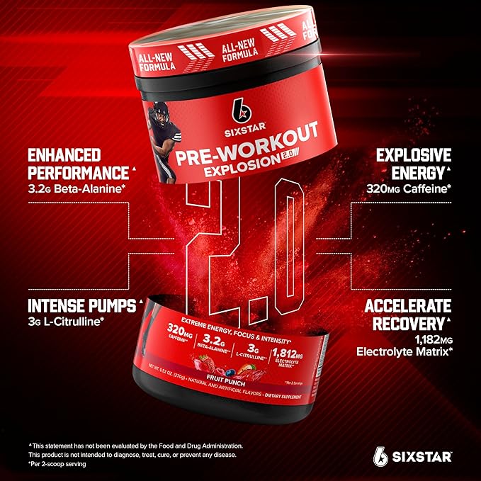 - Ignite Your Training Sessions: SIXSTAR Pre-Workout Explosion 2.0 fires up your workouts with extreme energy, focus, and intensity.* Fruit Punch flavor. 30 scoops per tub.