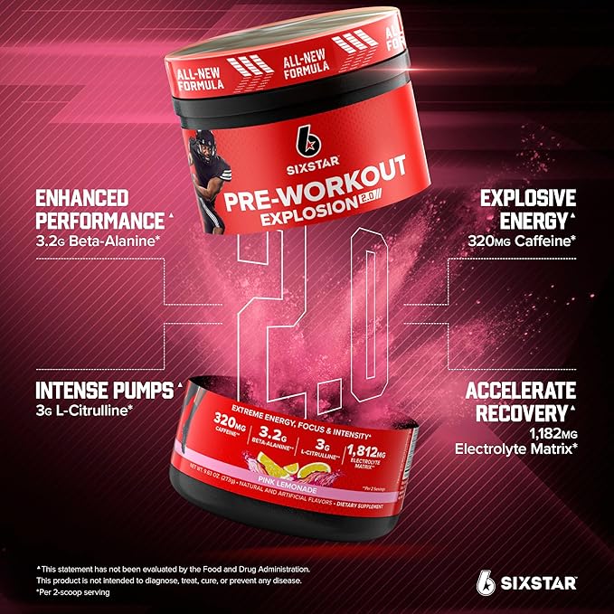 - Ignite Your Training Sessions: SIXSTAR Pre-Workout Explosion 2.0 fires up your workouts with extreme energy, focus, and intensity.* Pink Lemonade flavor. 30 scoops per tub.