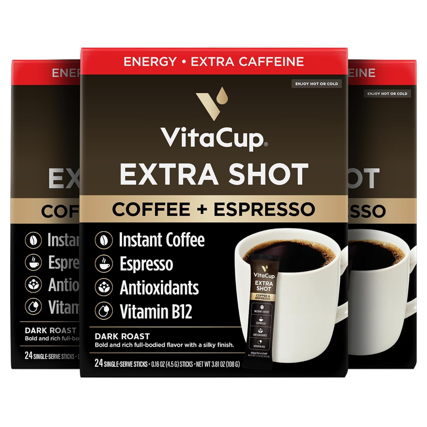 VitaCup Extra Shot Instant Coffee Packets with Espresso Shot, “Red Eye” High Caffeine, Bold Dark Roast w/Vitamin B12, Antioxidants, Premium Instant Coffee in Single Serve Sticks, 72 Ct