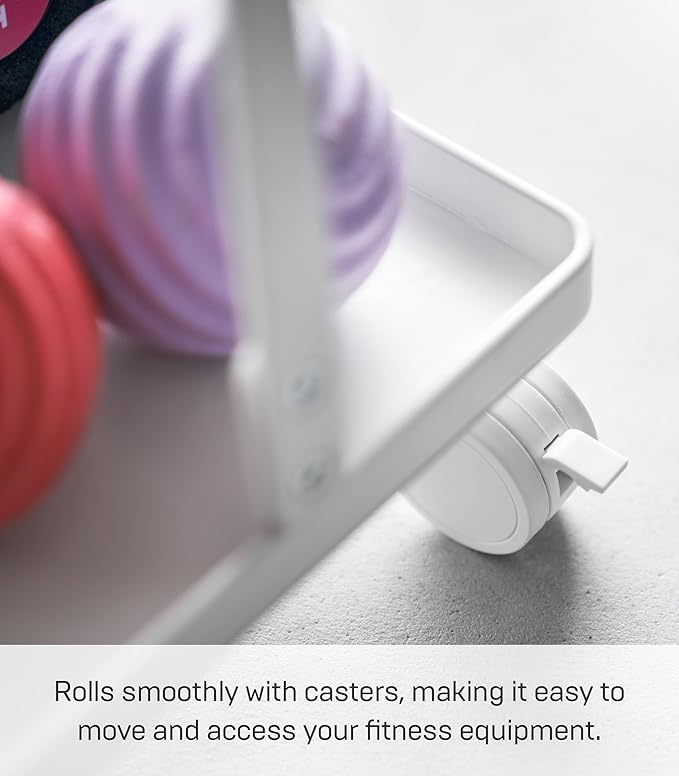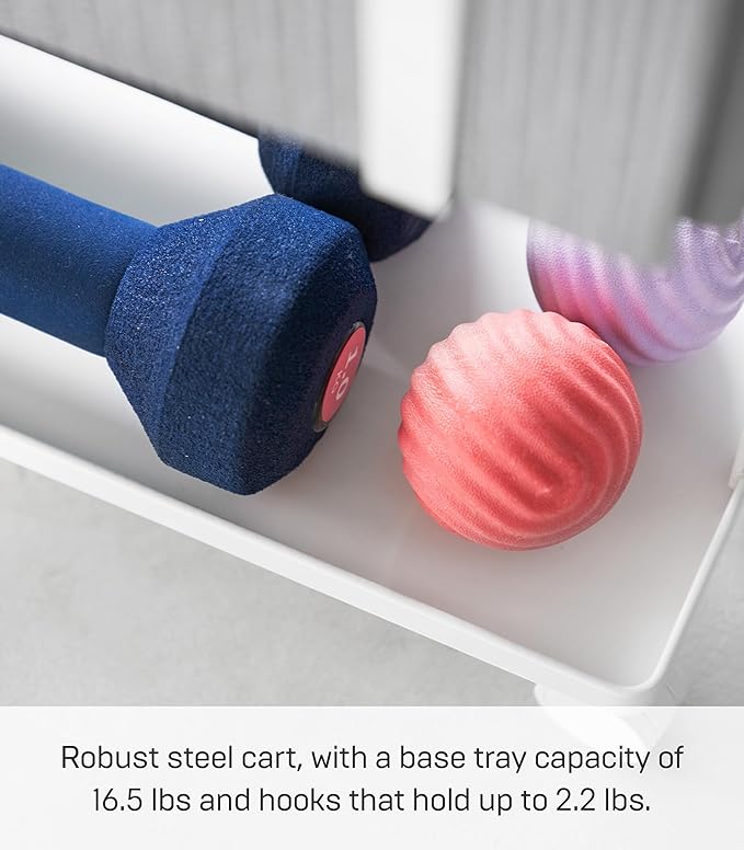 - [Fitness goods storage] If you like stretching and exercising at home, this slim rolling cart is a must to keep everything organized, with areas for dumbbells, yoga mats, foam rollers, towels, and much more.