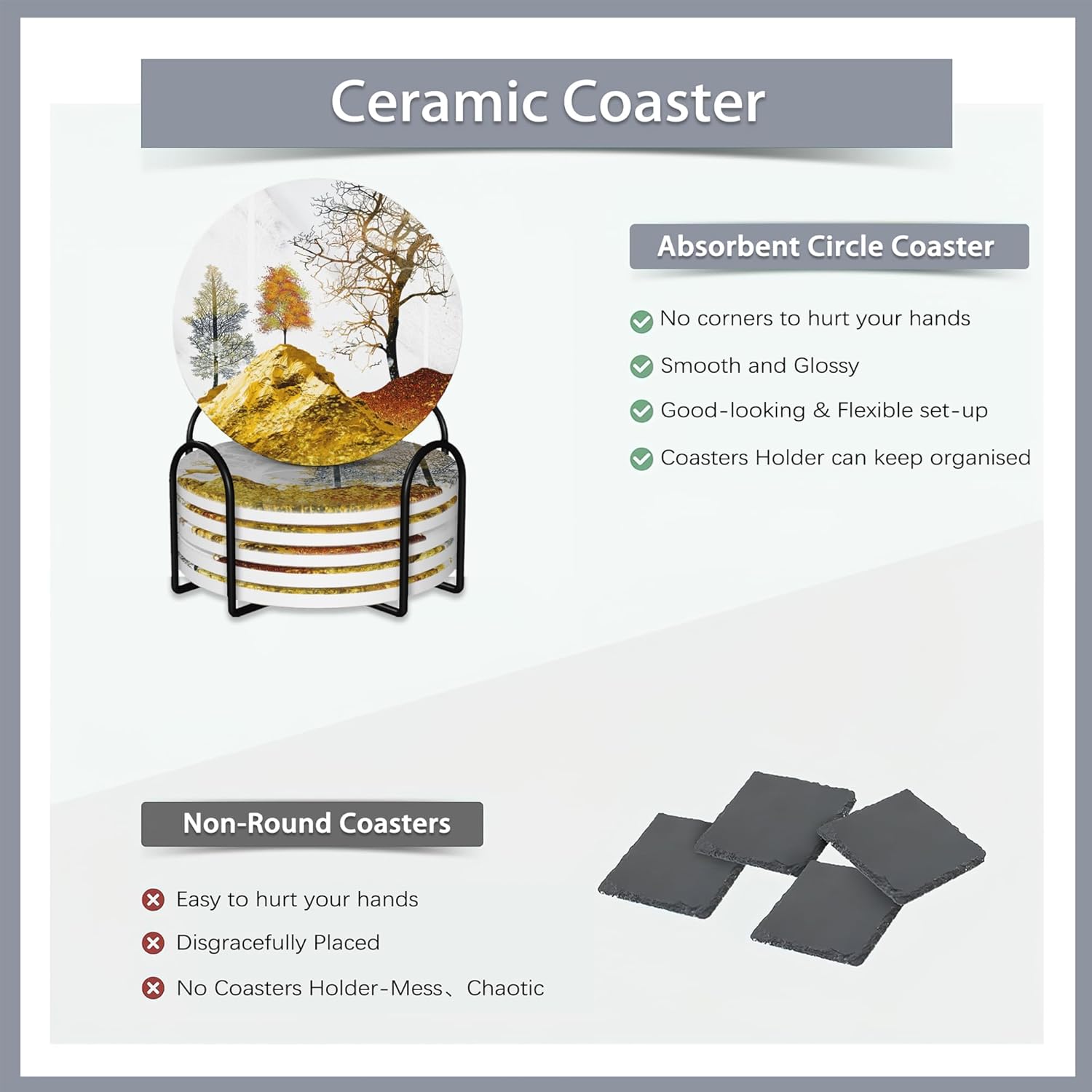 - 【Coaster with Metal Holder Set】The set includes 6 round ceramic coasters and metal coaster holder.