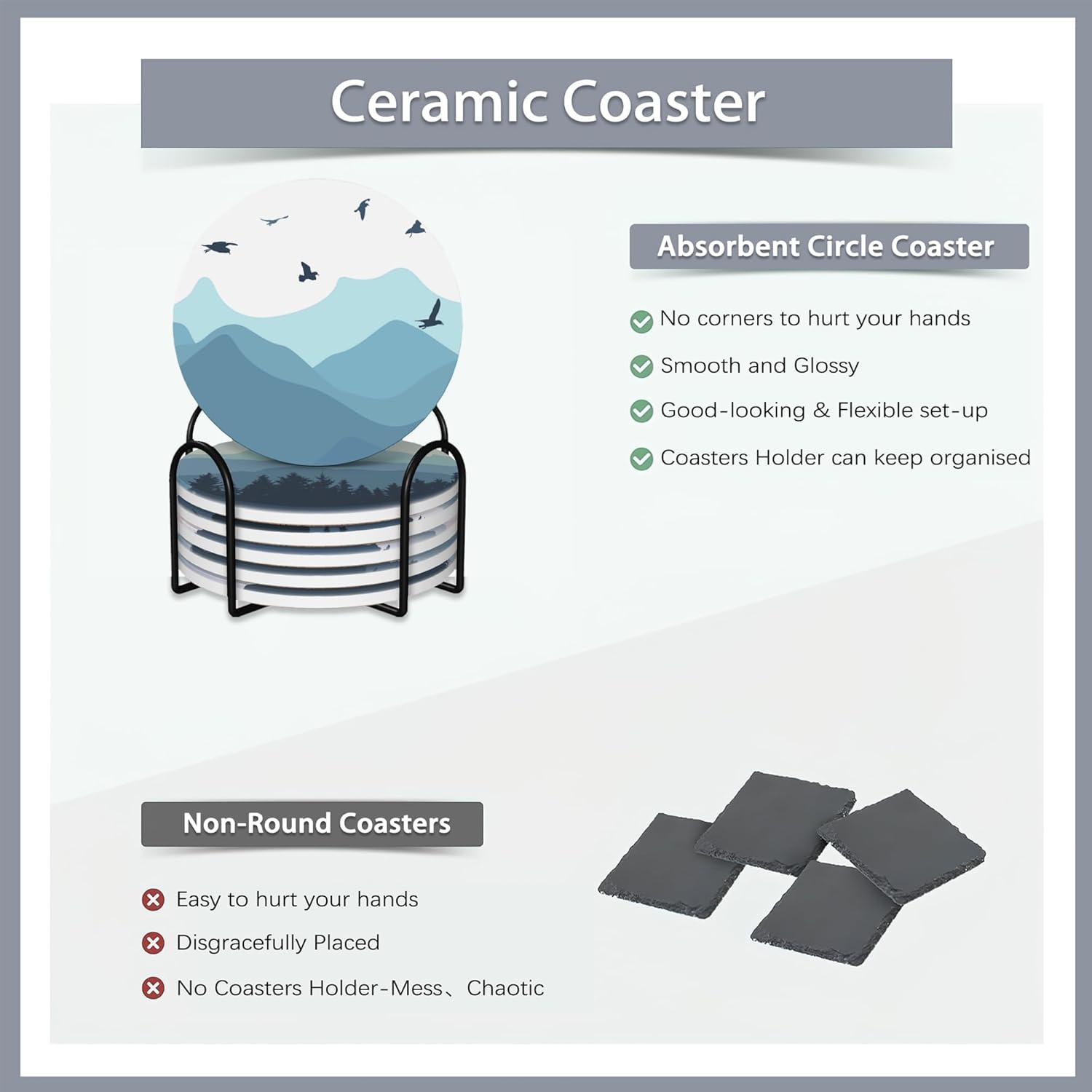 Drink Coasters Set of 6 with Holder,Misty Forest Mountains and Birds Absorbent Ceramic Coasters with Cork Base,Fit All Cups,Tabletop Protection Mat for Mugs and Cups,Office,Kitchen
