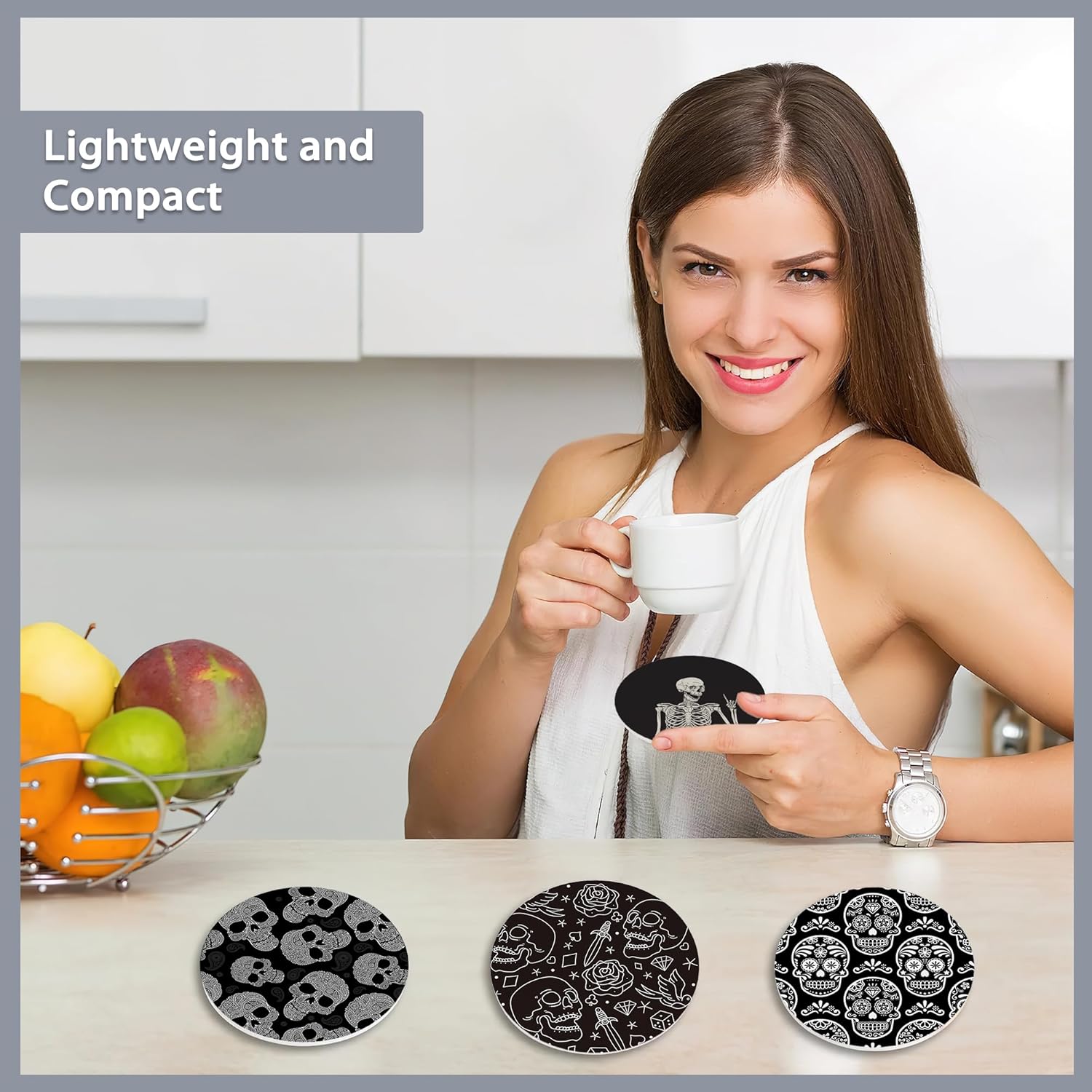 Drink Coasters Set of 6 with Holder,Human Skeleton Posing Skull Head Absorbent Ceramic Coasters with Cork Base,Fit All Cups,Tabletop Protection Mat for Mugs and Cups,Office,Kitchen