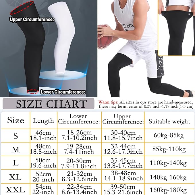 - Anti-slip Design: Our long leg sleeves have a circle of silicone anti-slip strips and elastic compression straps on the top, which can keep the position well and not easy to fall off, you can exercise at will. The leg sleeves also feature UV protection, protecting your legs from harmful sunlight so you're always protected during exercise