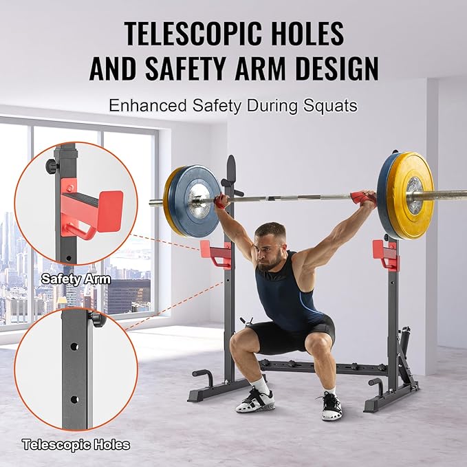 - Enhanced Safety: Unique weight-bearing design ensures a more robust and safer frame for holding weights. Additionally, safety arms amplify safety during squats.