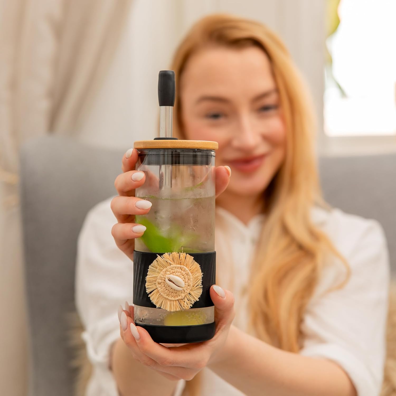 - EXCLUSIVE BONUS: Offering unrivaled value for money: 2 unbreakable straws: 1 Normal Size; great for Iced Coffee & Water + 1 Large Size one; ideal for shakes, smoothies & Boba + a Cleaning straw brush. 2 Different Lids: 1 Bamboo Lid; Perfect for Indoor use & a second lid 100% Leakproof ; Ideal for Outdoor Use! Presented in a beautiful Gift Box. With so many second-rate Glass Tumbler With Lid and Straw available on the market we wanted to set ourselves apart and be the best!