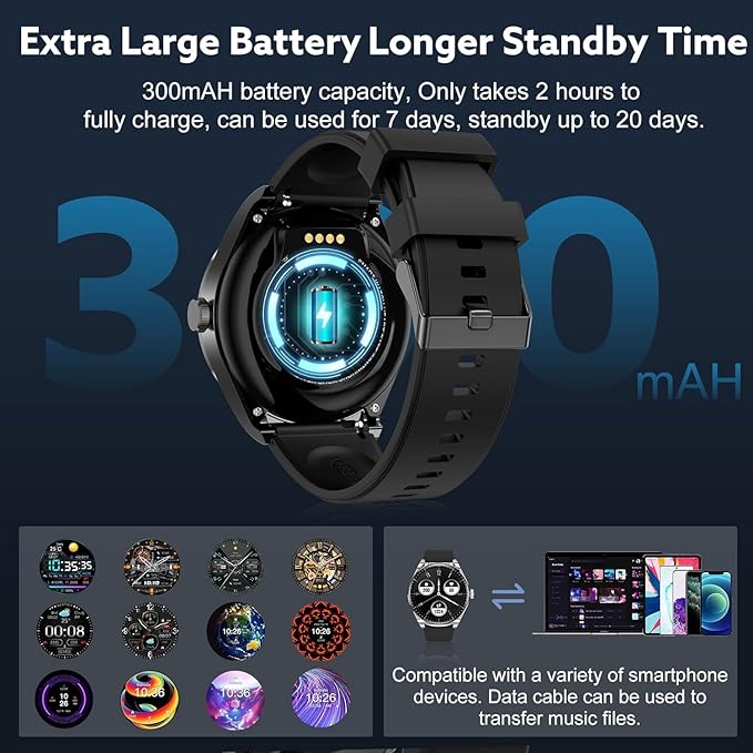 - 【Hi-Fi Stereo Sound 】This smart watch for women men adopt the most advanced Bluetooth5.0 technology,low delay,low power consumption.Keep your calls and music audio stable and will no longer be disturbed.Bluetooth wireless earbuds are equipped with intelligent touch system,you can easily control the headphones.Lossless HD sound quality enables you to enjoy clear and wonderful music moment.