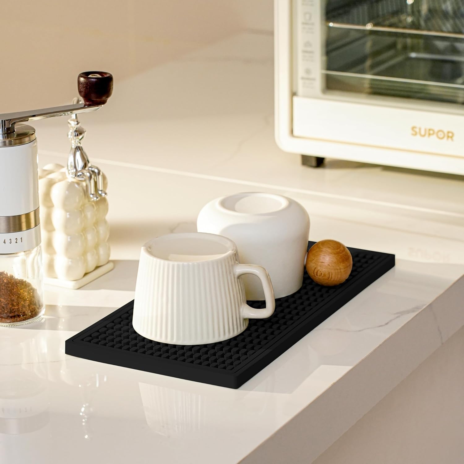 - MEDIUM SIZE: Our black bar mat measures 12*5.9 inches, which is a medium size and comes in a set of 2 packs, which can meet the needs of most bars and coffee counters. Whether your counter is large or small and delicate, this mat fits perfectly and effectively protects your tabletop surface.