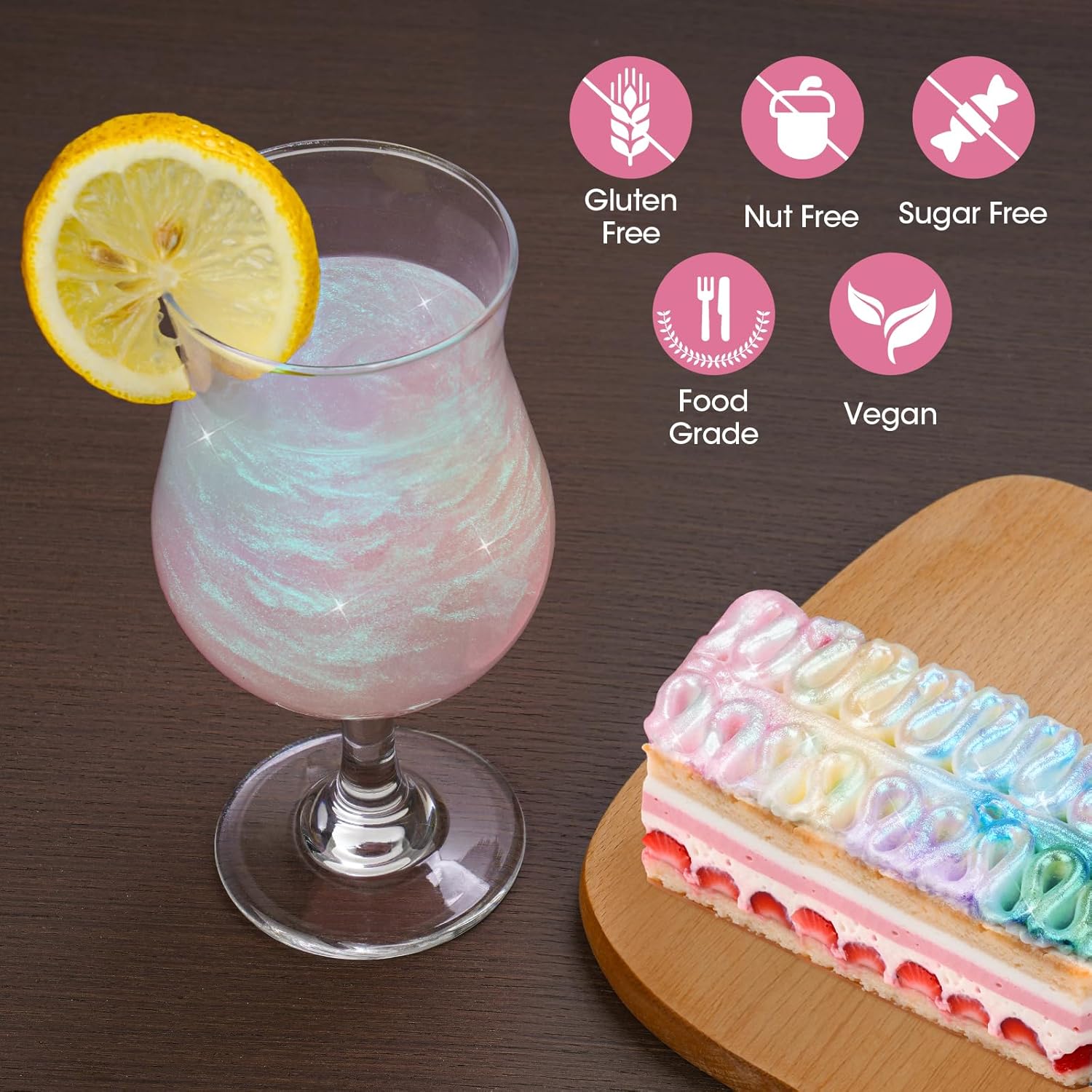 - ✔️【Vegan & Allergen-Free】Food-grade glitter uses only the highest quality vegan ingredients and does not contain common food allergens, including gluten, nuts or dairy products, so everyone can use and enjoy this product regardless of diet or food allergies. Unlike food contact glitter, these are 100% edible, so you don't need to worry about using them in your creations to make them sparkle for all.