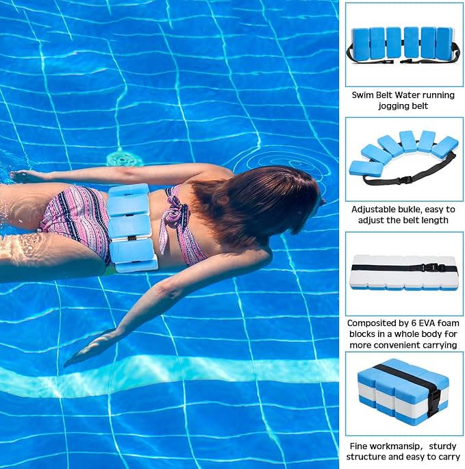 - Practical Swim Belt: the water weights equipment consists of 6 EVA foam blocks, sized at around 16.6 x 5.9 x 1.85 inches, suitable for waist sizes from about 22.8" to 42.1"; The swimming belt comes with a durable adjustable shoulder strap and buckle that can be fixed at the waist for easy adjustment; Provides you with flotation assistance while in the water, ideal for non swimmers or beginner swimmers who need support