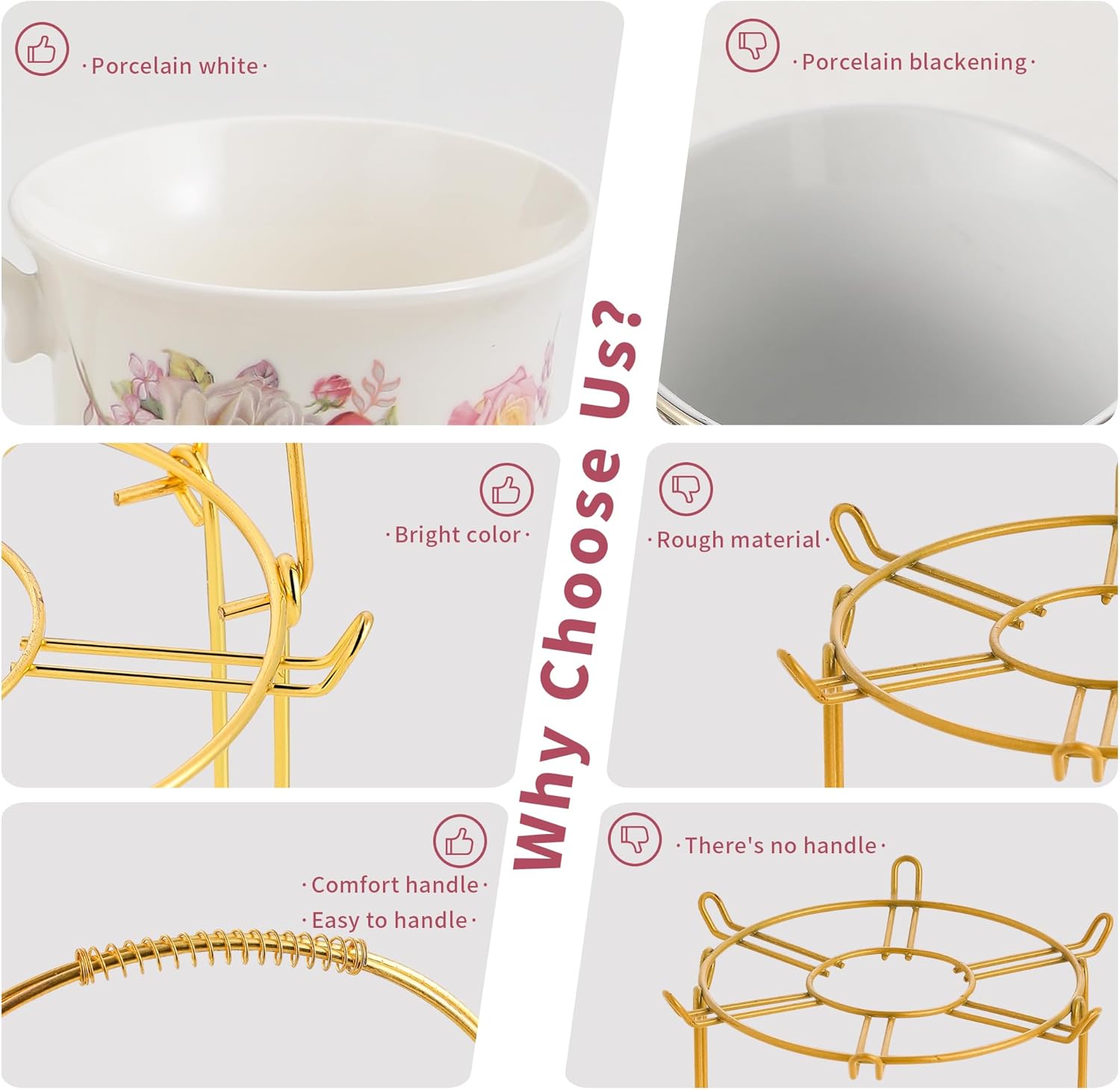 20-Pieces Porcelain Bone china Tea Sets,Gold Rim Coffee Set with Golden Metal Rack,Tea Gift Sets for Home&Party(003)