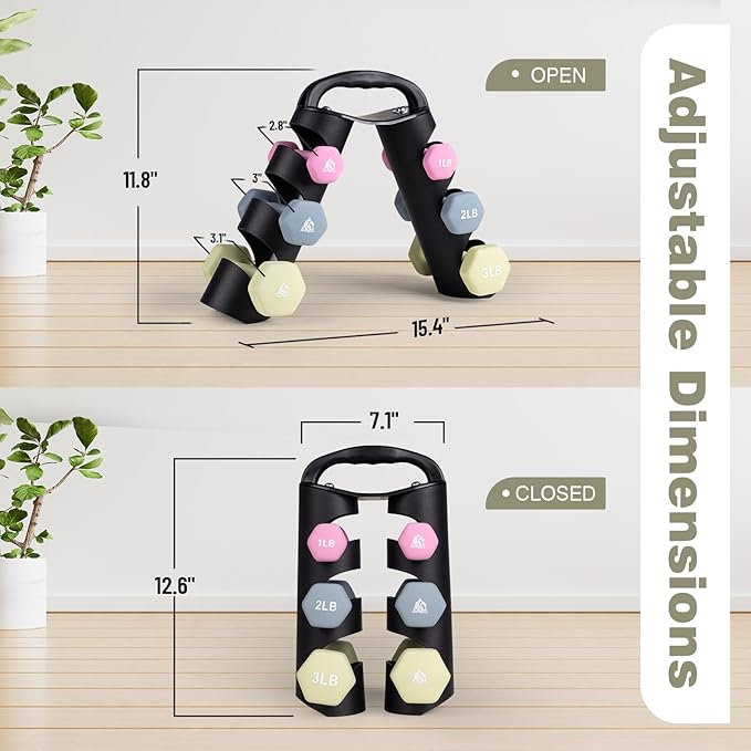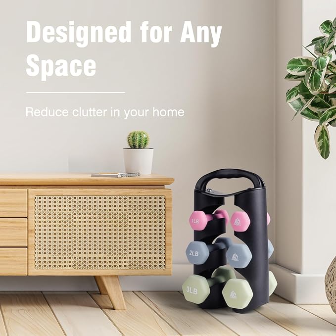 - Practical Gift for You & Your Family: Set includes pairs of 1lb, 2lb, 3lb neoprene coated hex dumbbells with a unique dumbbell rack for storage, which is perfect for physical therapy and daily workout. Light bright color and soft touching feel will please everyone. It also comes with a poster to help plan your workout.