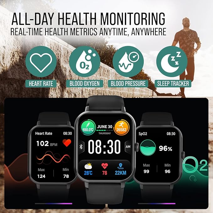 - 【24-Hour Health Monitoring】All day continuous real-time heart rate, blood pressure, and blood oxygen monitors with built-in sleep tracker (REM, light/deep, wakefulness). Automatically log your health data in the app to get a better understanding of your well-being trends over time.