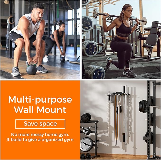- Protective Pad Designed - The Gym Home Rack Wall-mounted Organizer(Package includes 2 carabiners) is sprayed with a matte matte anti-rust layer and comes with a rubber pad to protect your barbell coating.The surface is smooth and durable against rust.Provides good care for your steel bars, and you can use them for a long time