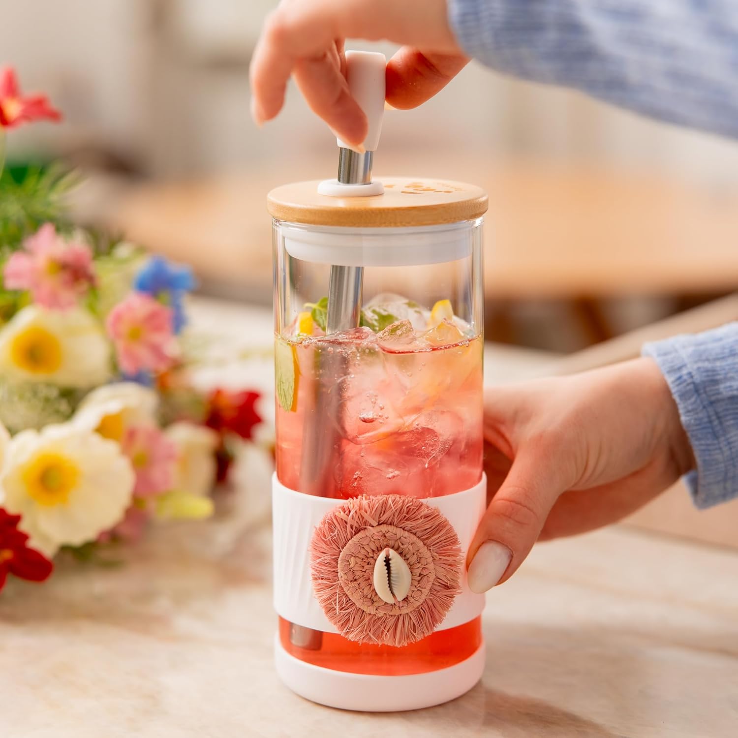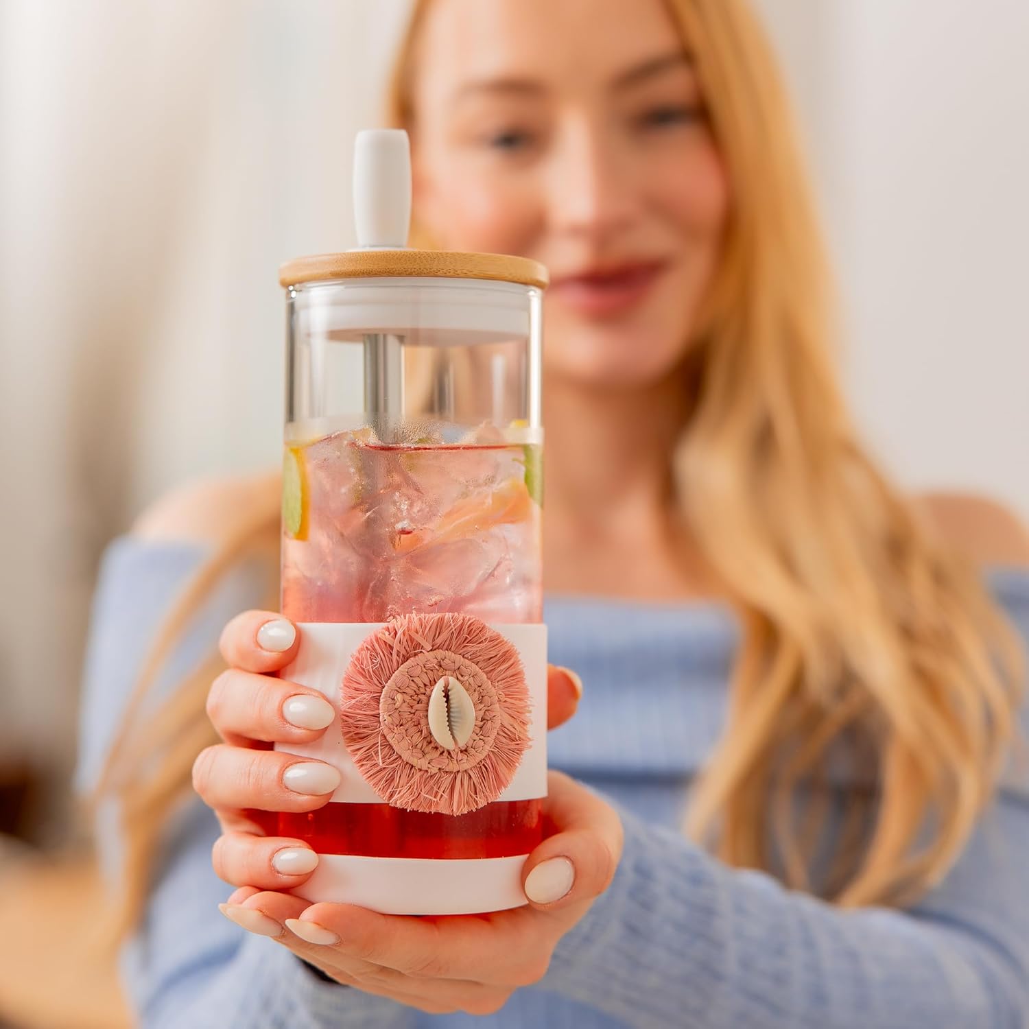 - THE ULTIMATE TRENDY GLASS TUMBLERS: These 20 Fl Oz Glass Cups With Lids and Straws are perfect for showing off your latest drink creations. The multiple components of the pack ensure a comfortable drinking experience and make them great as infusion Glass Tumblers for fruity drinks, Smoothies, Boba, or Iced Coffee Cups With Lids.