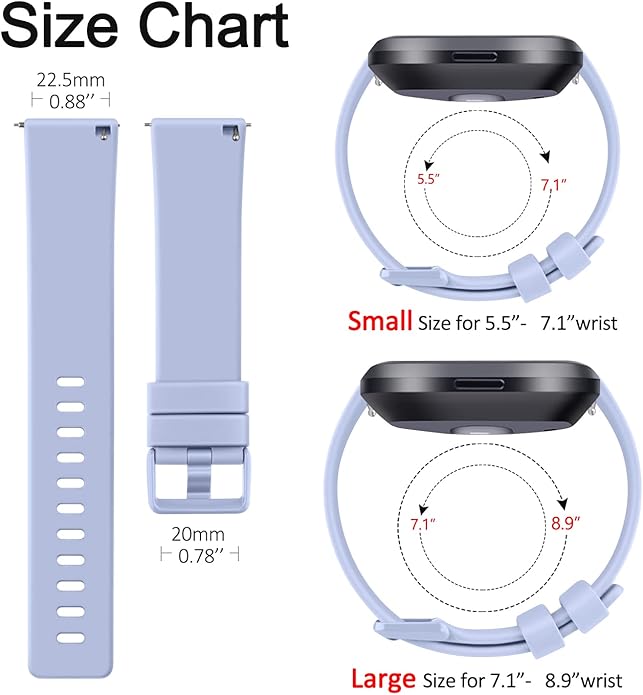 - Available in multiple colors and two sizes for Fitbit Versa 2 bands / Fitbit Versa bands / Fitbit Versa Lite bands women men, freely adjustable stainless steel buckle holds Versa sturdily. Each color is seemed like a brand new watch. Small Size fits for 5.5" - 7.1" (140mm-178mm) wrist. Large Size fits for 7.1" -8.7"(178mm-220mm) wrist.
