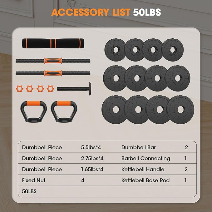 - 【4 in 1 Multifunctional Dumbbell Set】With the adjustable dumbbell set, it can boost your home workout level. Easily transform it into dumbbells, barbells, kettlebells, and push-up bars, switch exercise modes as you like. A 4-in-1 dumbbell set can meet your home gym needs and enjoy multi-faceted fitness